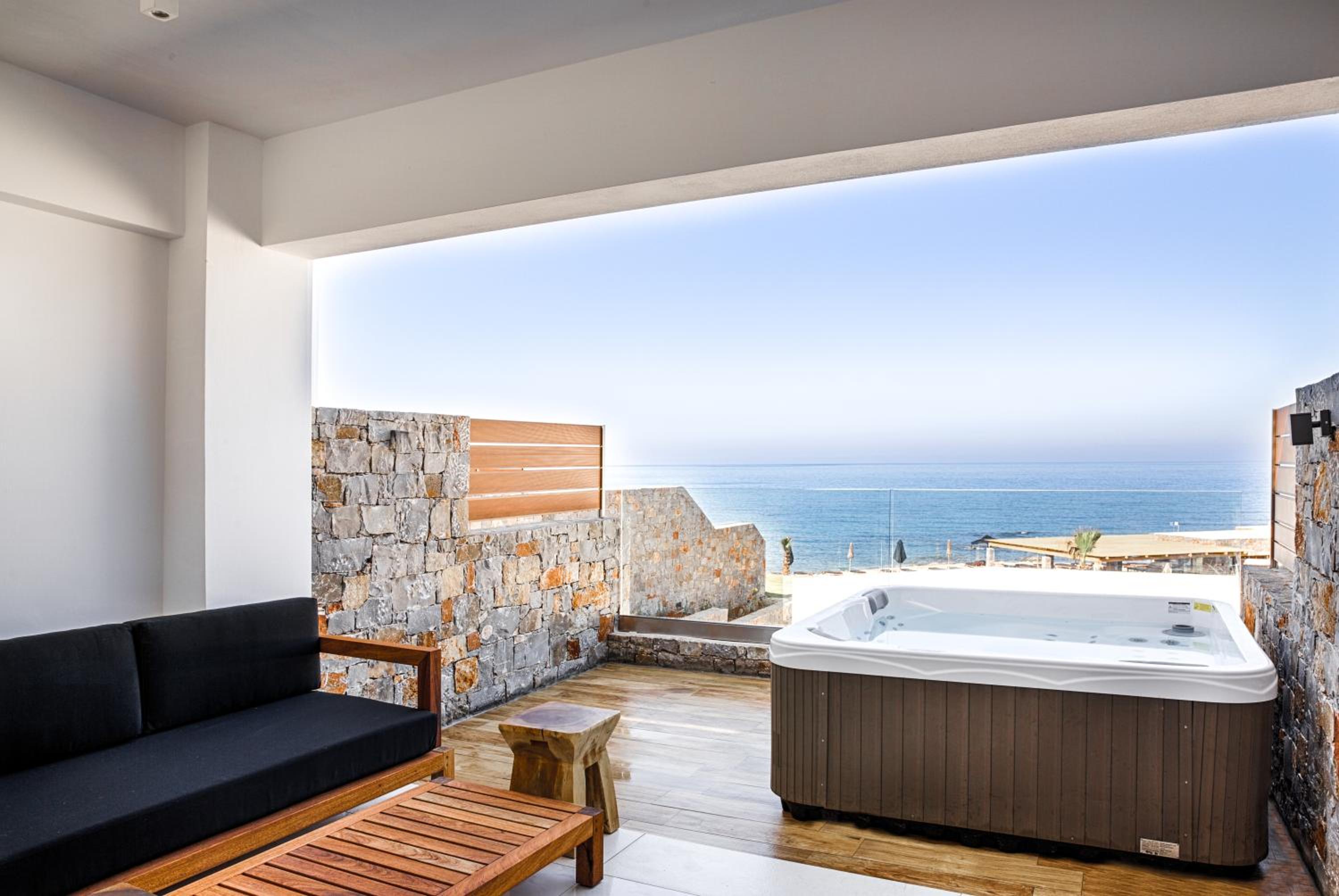 Exuding opulence and elegance, every room at the Abaton Island Resort & Spa offers breathtaking sea views and comes equipped with modern amenities like safes, minibars, Nespresso machines, flat-screens, and complimentary Wi-Fi. For those seeking an added touch of indulgence, options with Jacuzzis or private pools with swim-up access are also available.