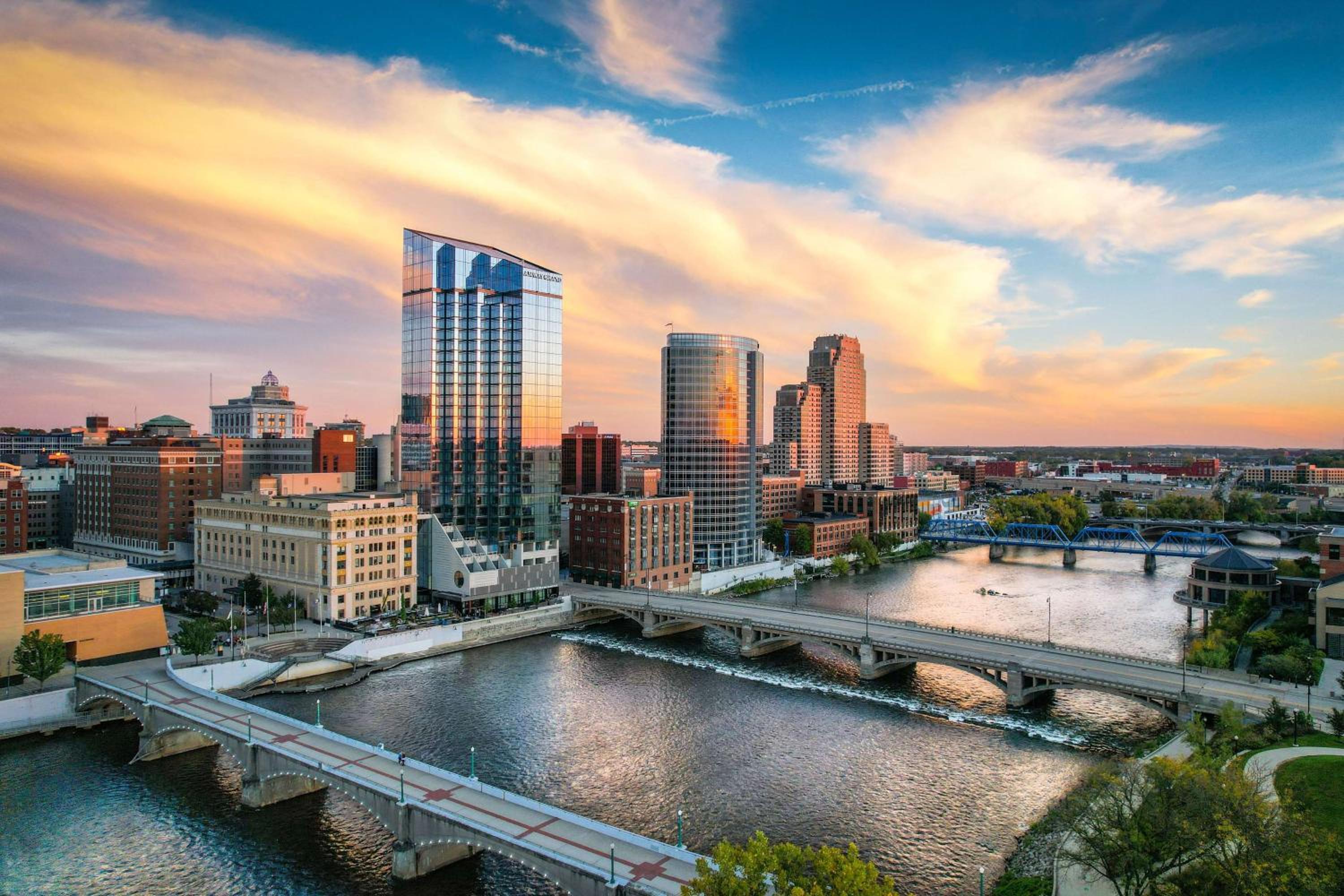 For nearly a century, the Amway Grand Plaza has graced the banks of the Grand River. Its rich history is evident in every corner, from original iron and woodwork to the elegant English Adams architecture. The hotel seamlessly combines this historic charm with contemporary comforts to offer a unique and unforgettable stay.