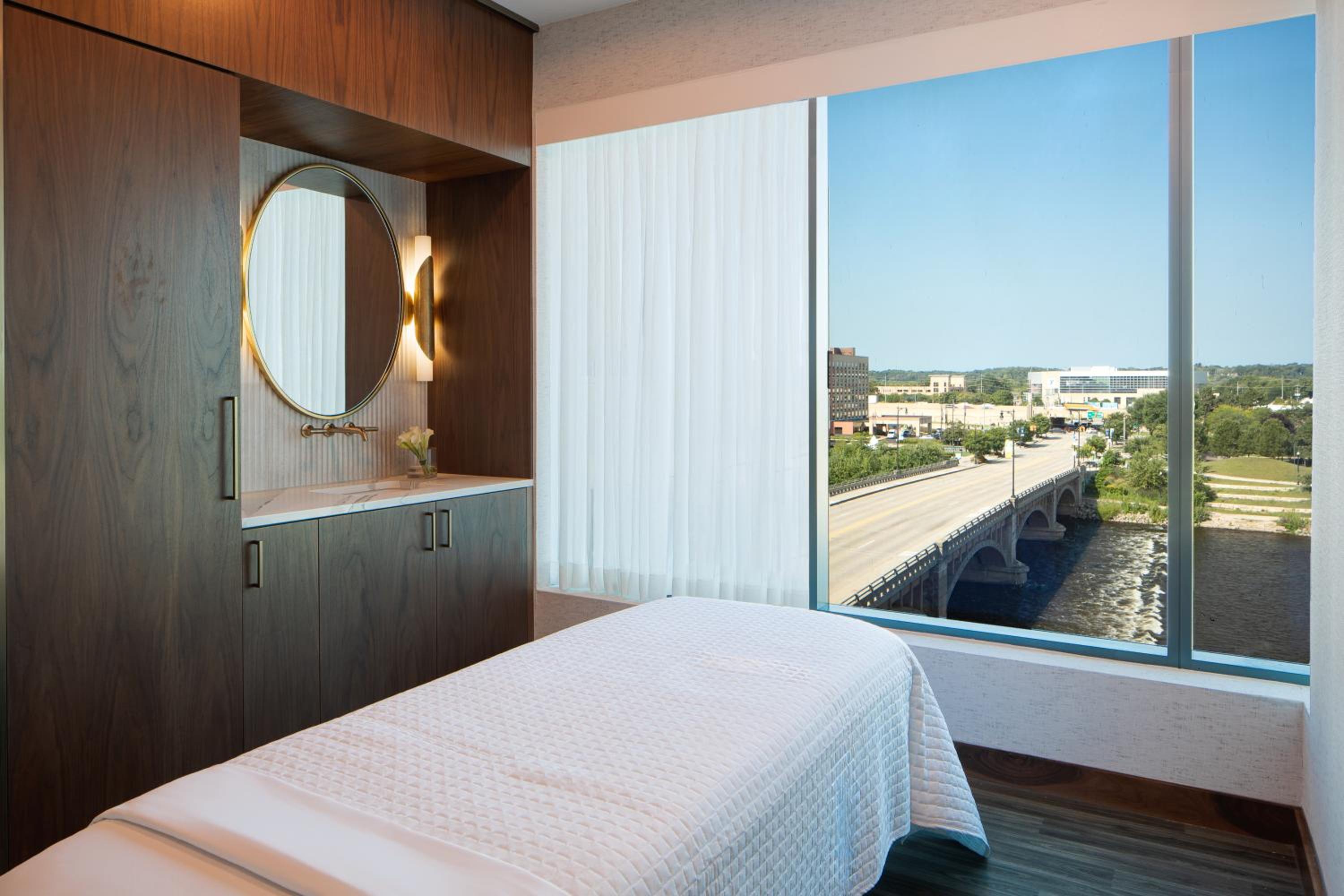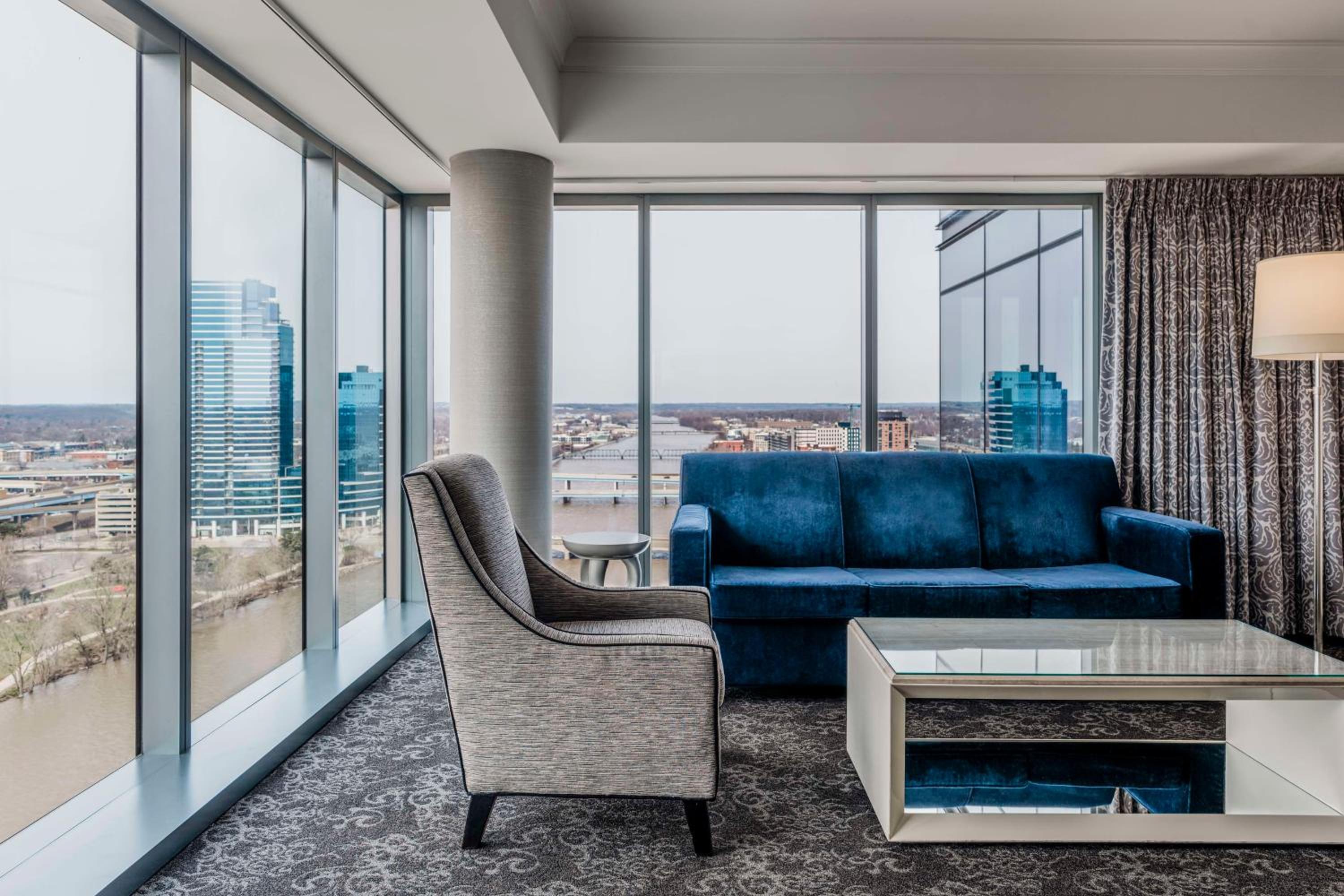 Guest rooms are designed for your utmost comfort and convenience. You can expect complimentary WiFi, a 42-inch HDTV for in-room entertainment, and a laptop-sized safe for your valuables. For honeymooners seeking an extra touch of luxury, there are five different styles of suites available, each with its own unique amenities. Some feature a dining area, a marble shower, or breathtaking views of downtown and the Grand River.