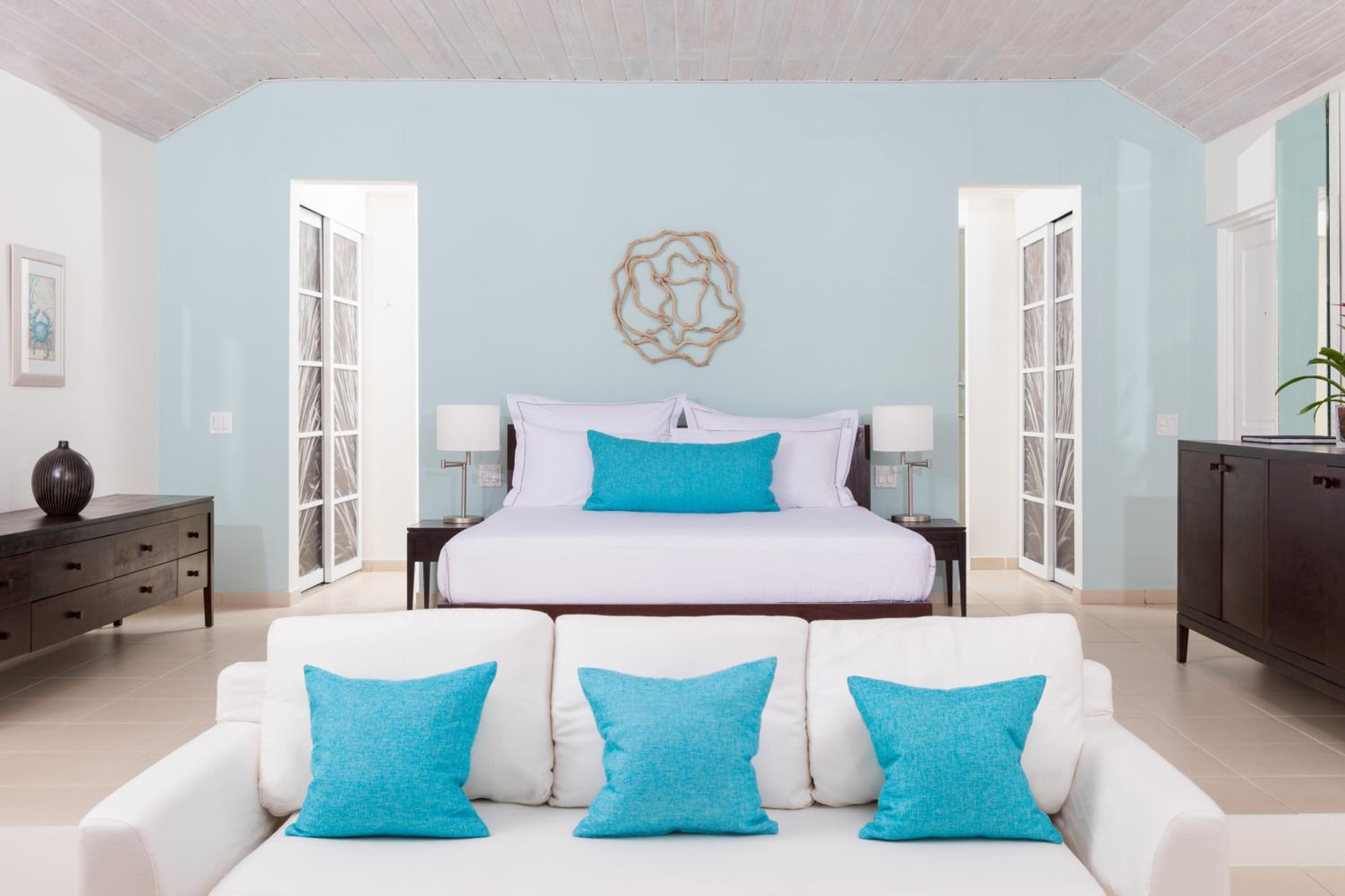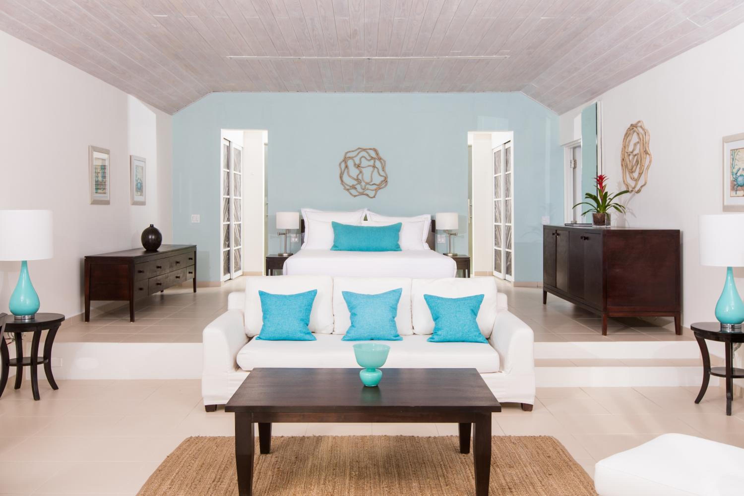As you step into the embrace of Carlisle Bay, you’re welcomed by 87 exquisitely-appointed suites offering sweeping ocean views through floor-to-ceiling windows. Each suite boasts a balcony or covered terrace adorned with comfortable day beds, perfect for basking in the Caribbean sunshine. The contemporary décor, calming colors, and open-plan sitting rooms create an ambiance of tranquility and sophistication.
