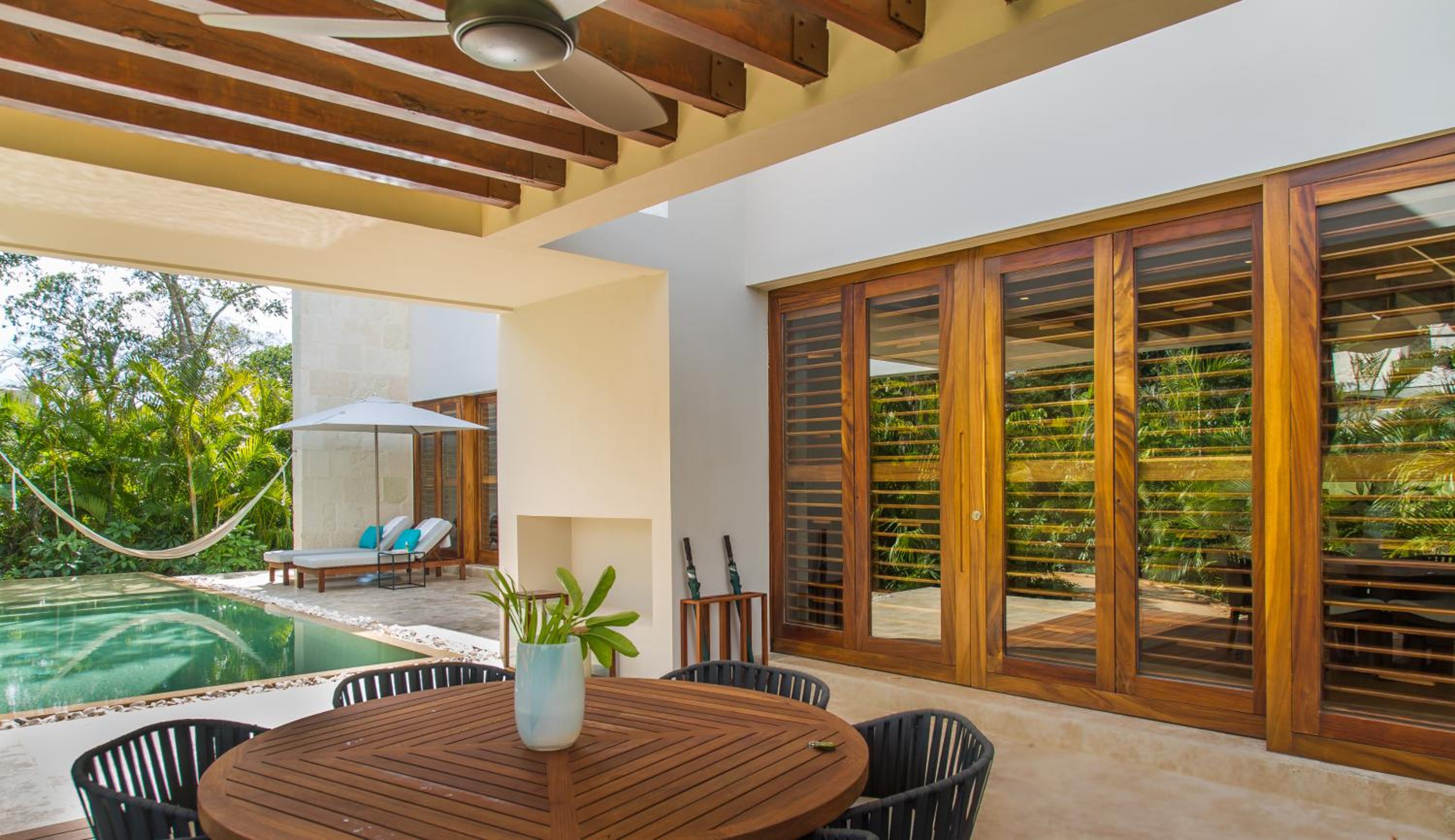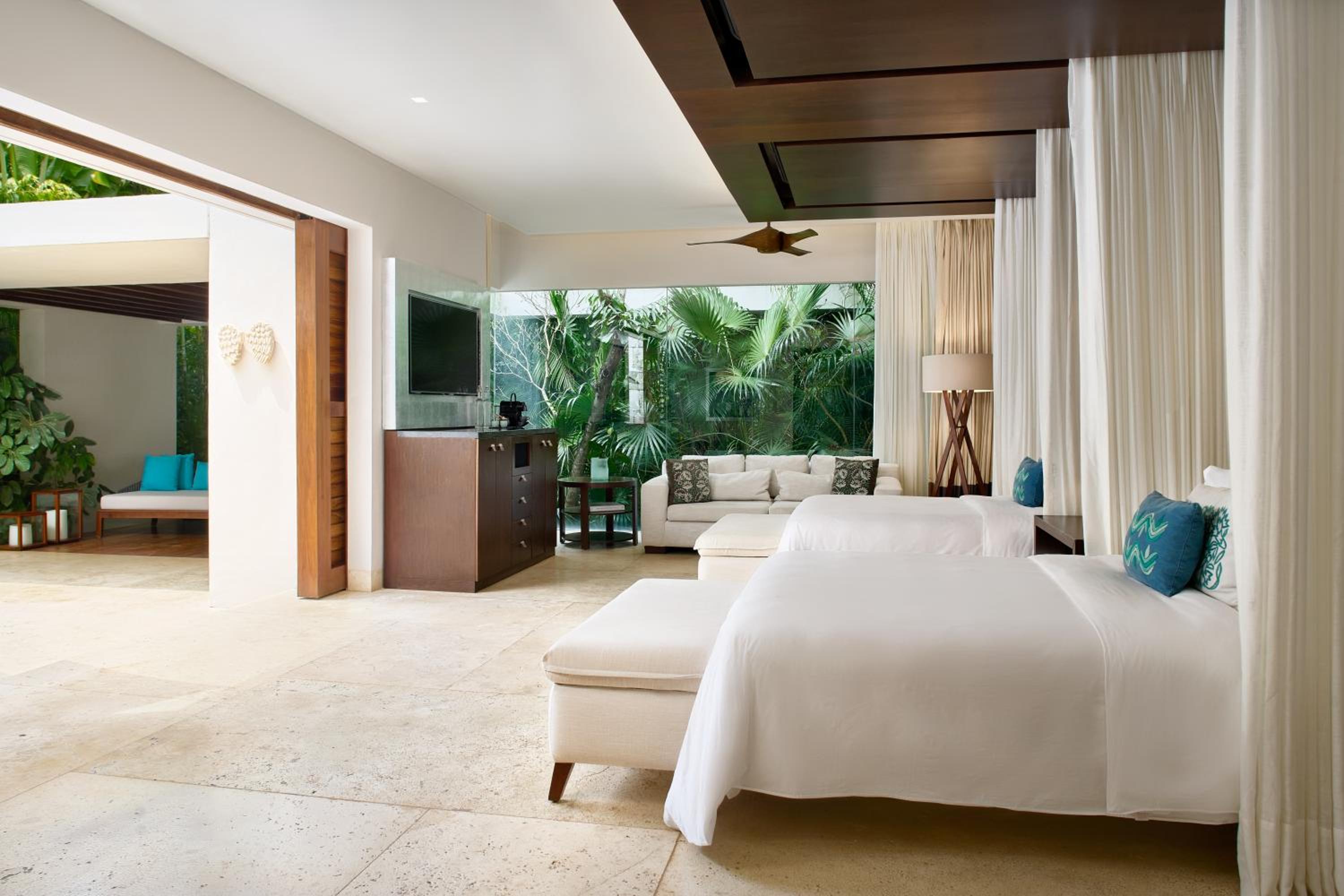 Chable Resort boasts modern suites equipped with a wealth of premium amenities. Each suite features private pools, inviting terraces, and relaxing hammocks. Outdoor showers and cozy sitting areas add to the charm of these suites. For your convenience, all rooms come with minibars, tea and coffeemakers, Internet access, satellite TV, and stereo systems.