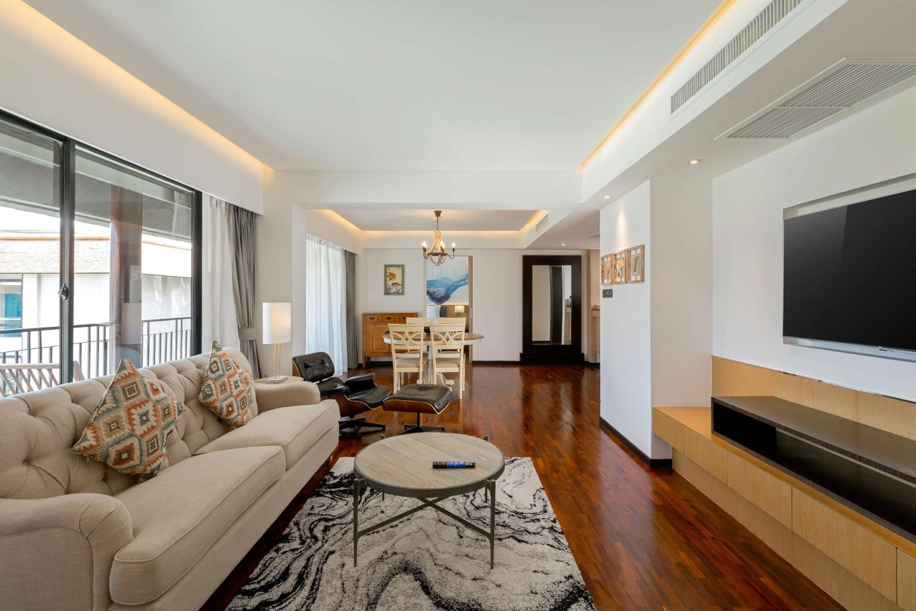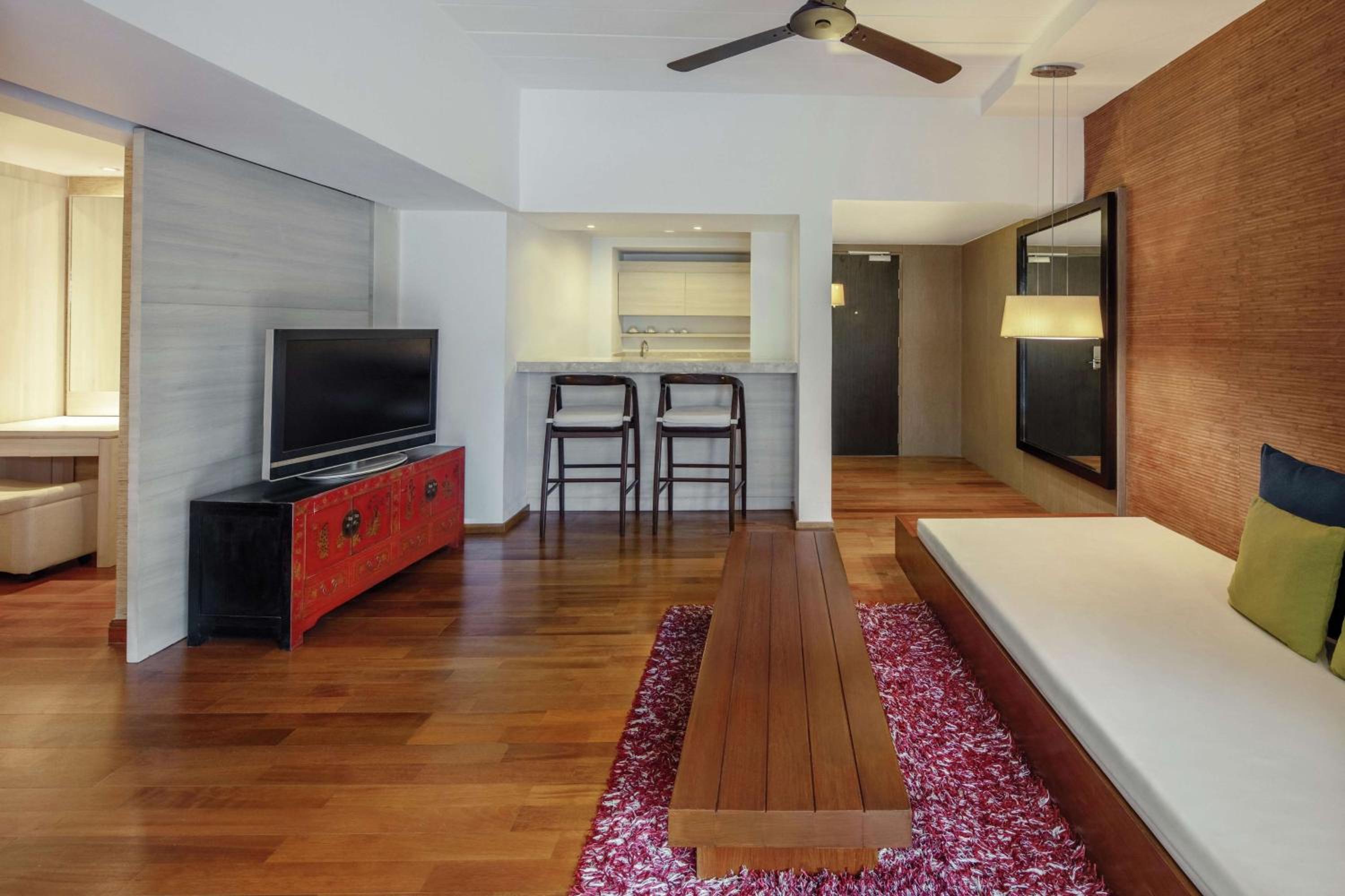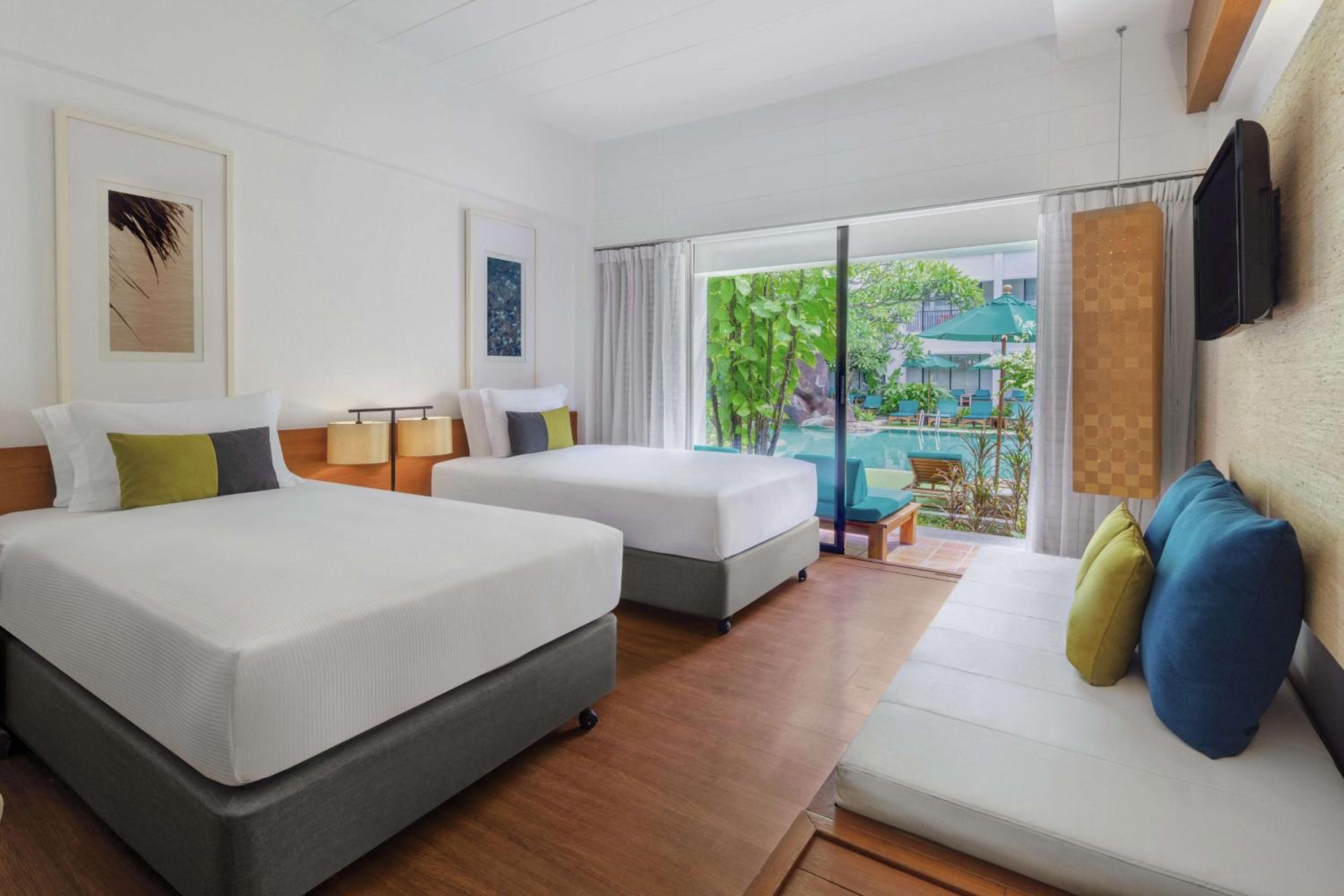 Indulge in spacious rooms or suites adorned with Thai-inspired decor. Each accommodation features a private balcony or terrace overlooking lush tropical gardens and one of the three inviting hotel pools. Your personal sanctuary provides the perfect backdrop for moments of intimacy and relaxation.