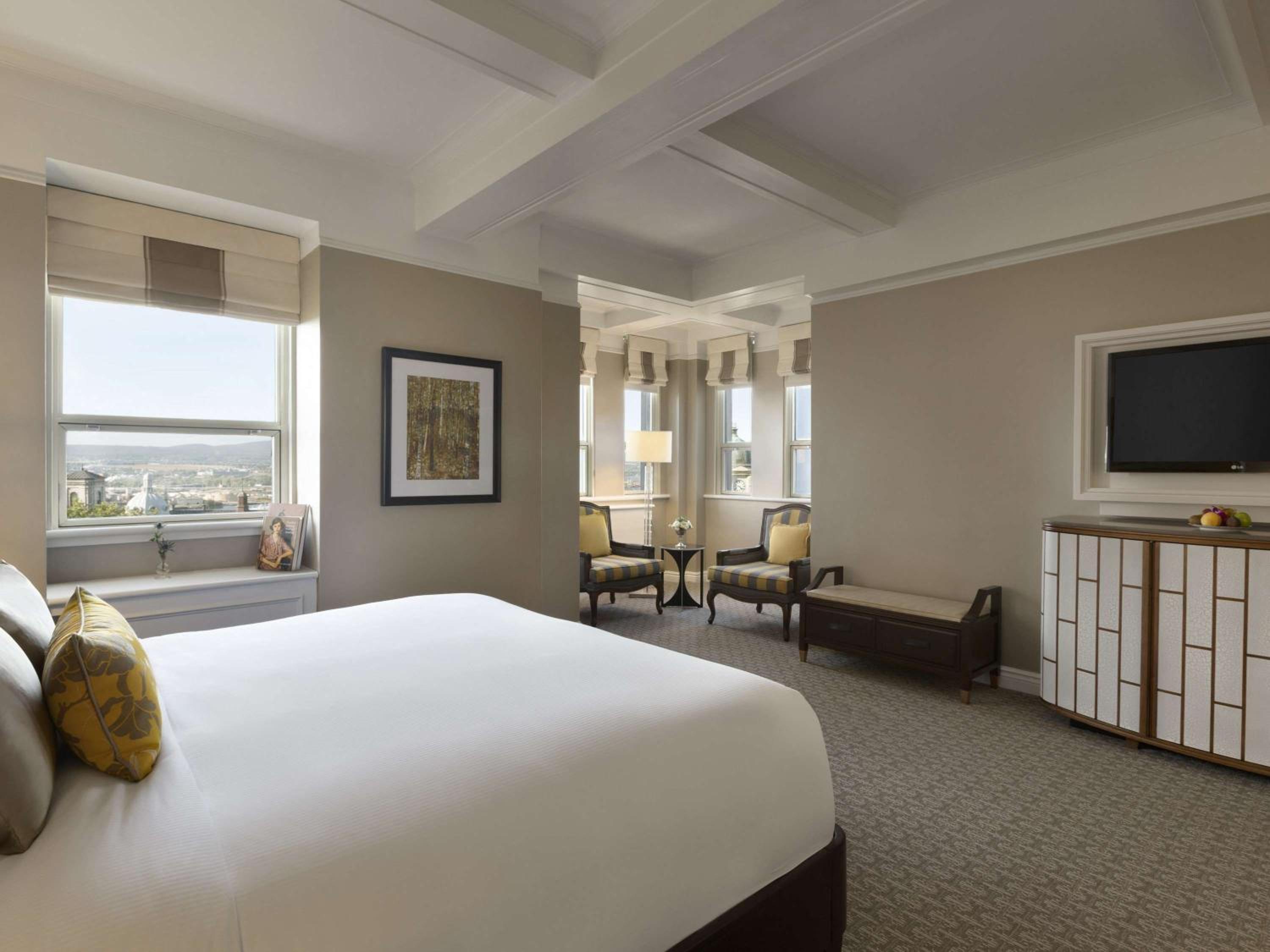 Every room in the hotel exudes sophistication, with a choice between traditional and contemporary decor. All rooms feature flat-screen TVs, Wi-Fi (for a fee), and tea and coffee makers at your disposal. Opt for an upgraded room, and you’ll be treated to stunning river views, some even boasting cozy sitting areas. The suites offer a more luxurious experience with spacious living rooms, extra bedrooms, and even marble bathrooms. And for those cozy nights in, room service is readily available.