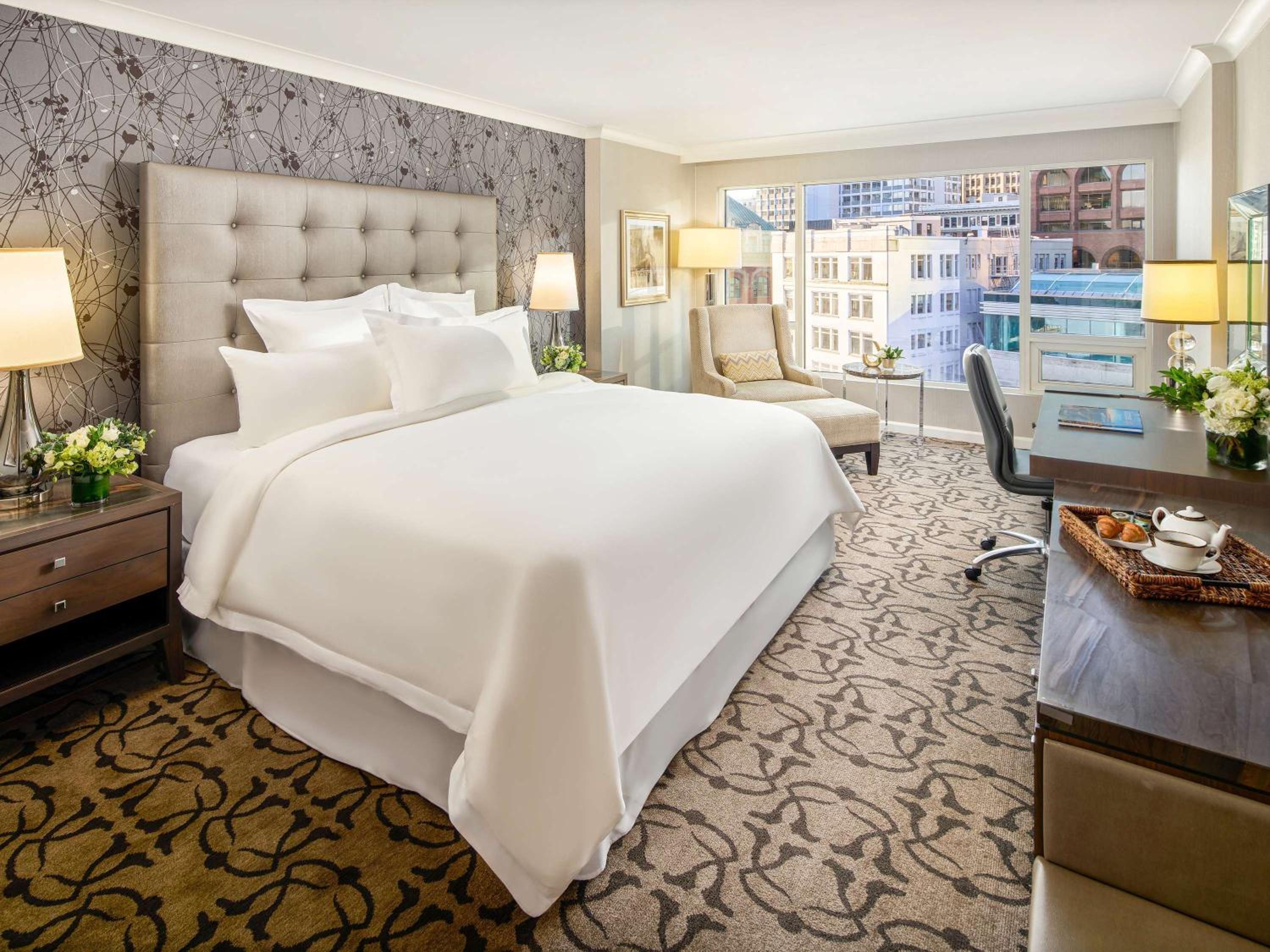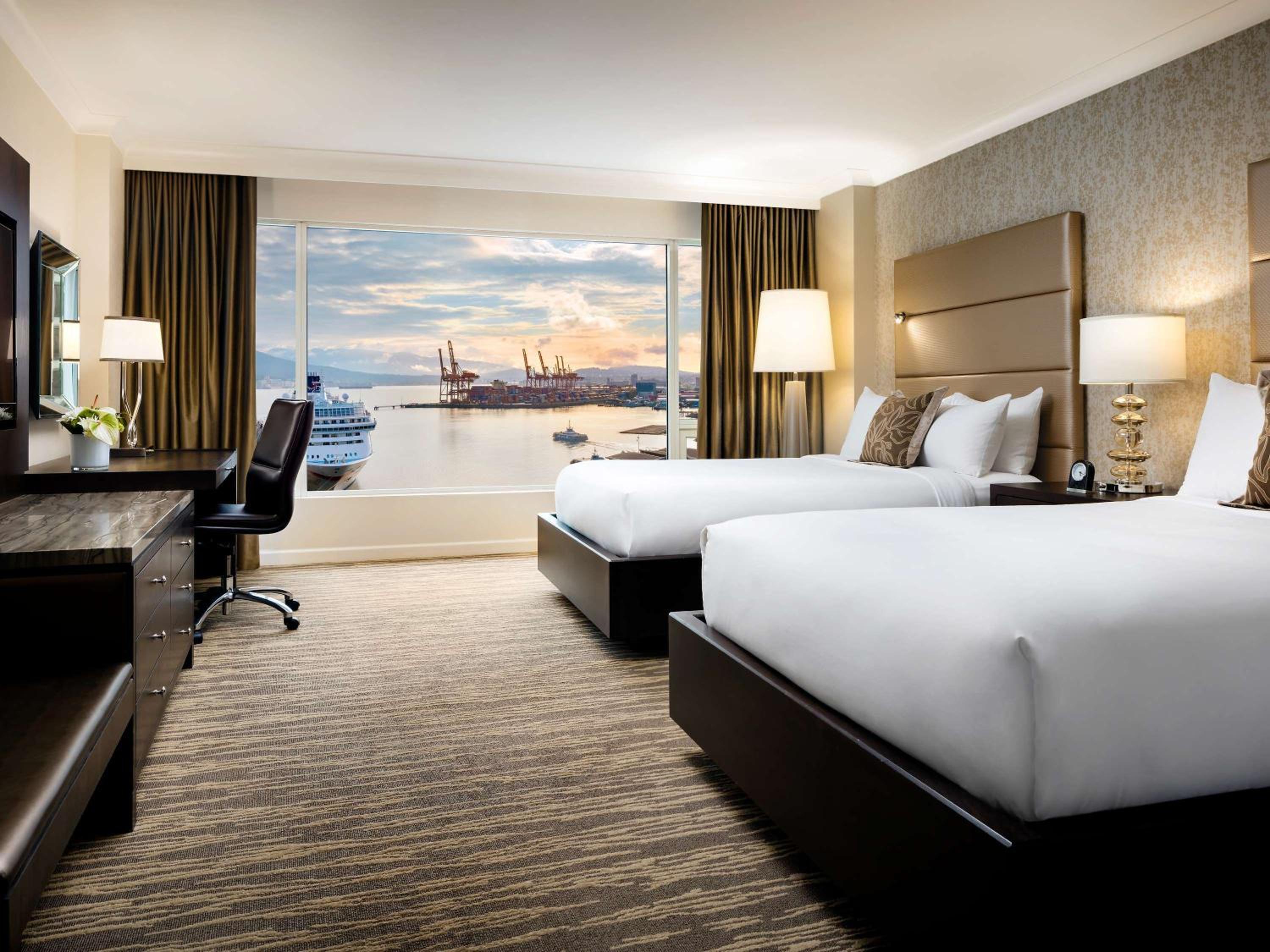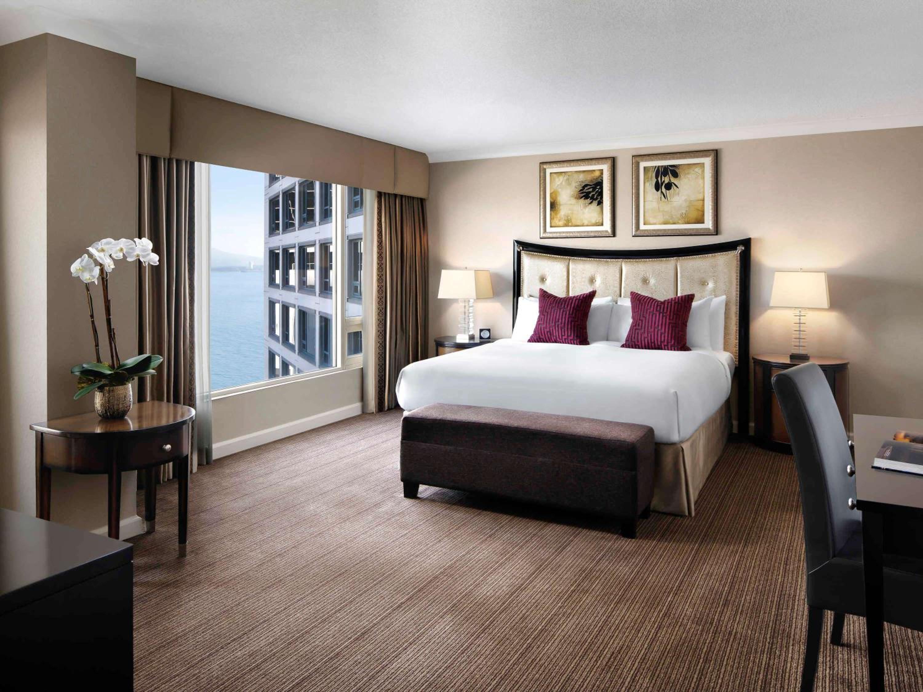 The Fairmont Waterfront offers contemporary rooms with top-notch amenities like flat-screen TVs, minibars, and plush bathrobes. Enjoy a comfortable stay with stunning views of the harbor and mountains.