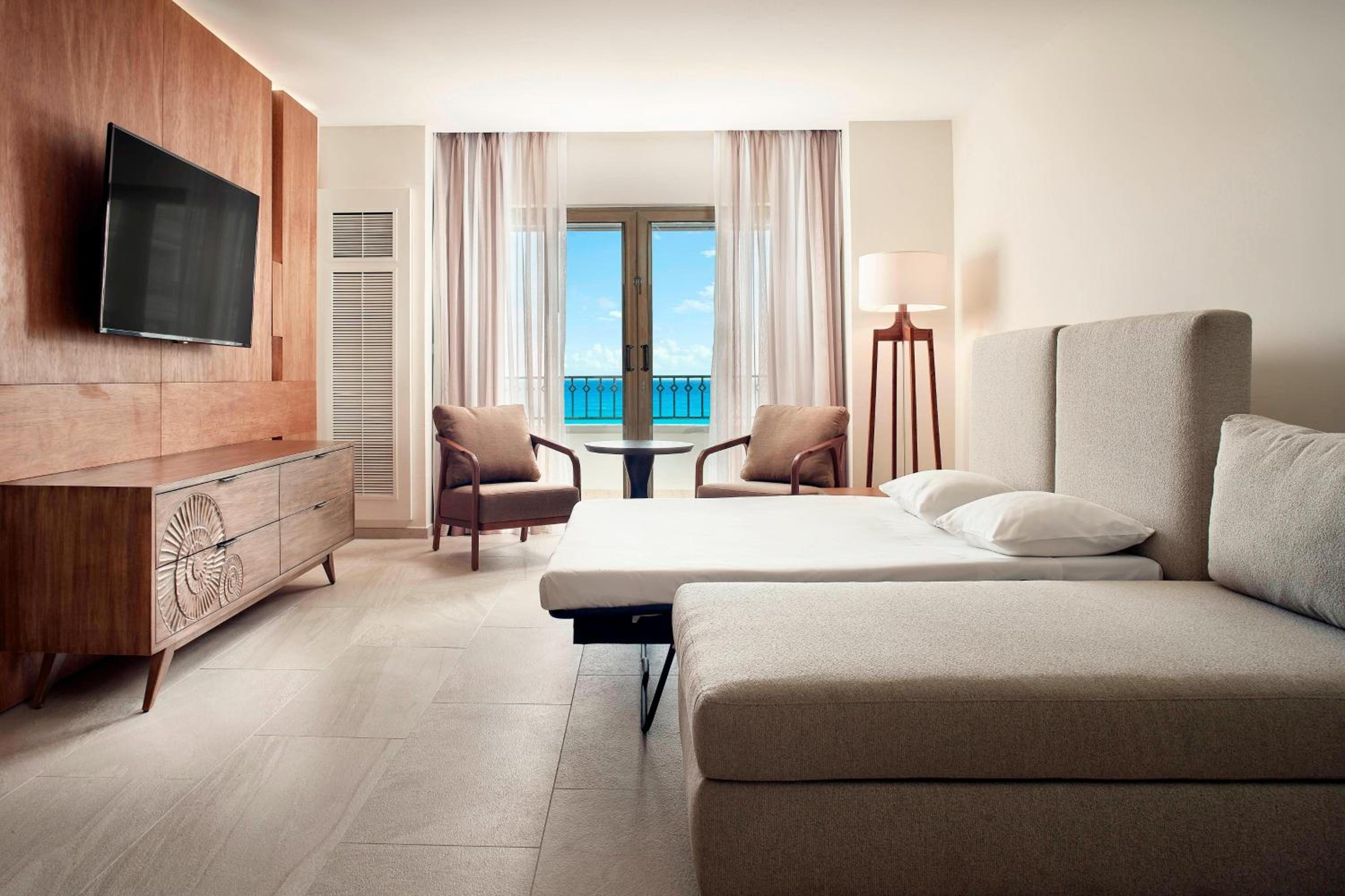 Elegant Guestrooms with Stunning Views: Indulge in lavish amenities including flat-panel LCD TVs and luxurious bedding while soaking in breathtaking views of Cancun's white sand beaches and the sparkling Caribbean waters.