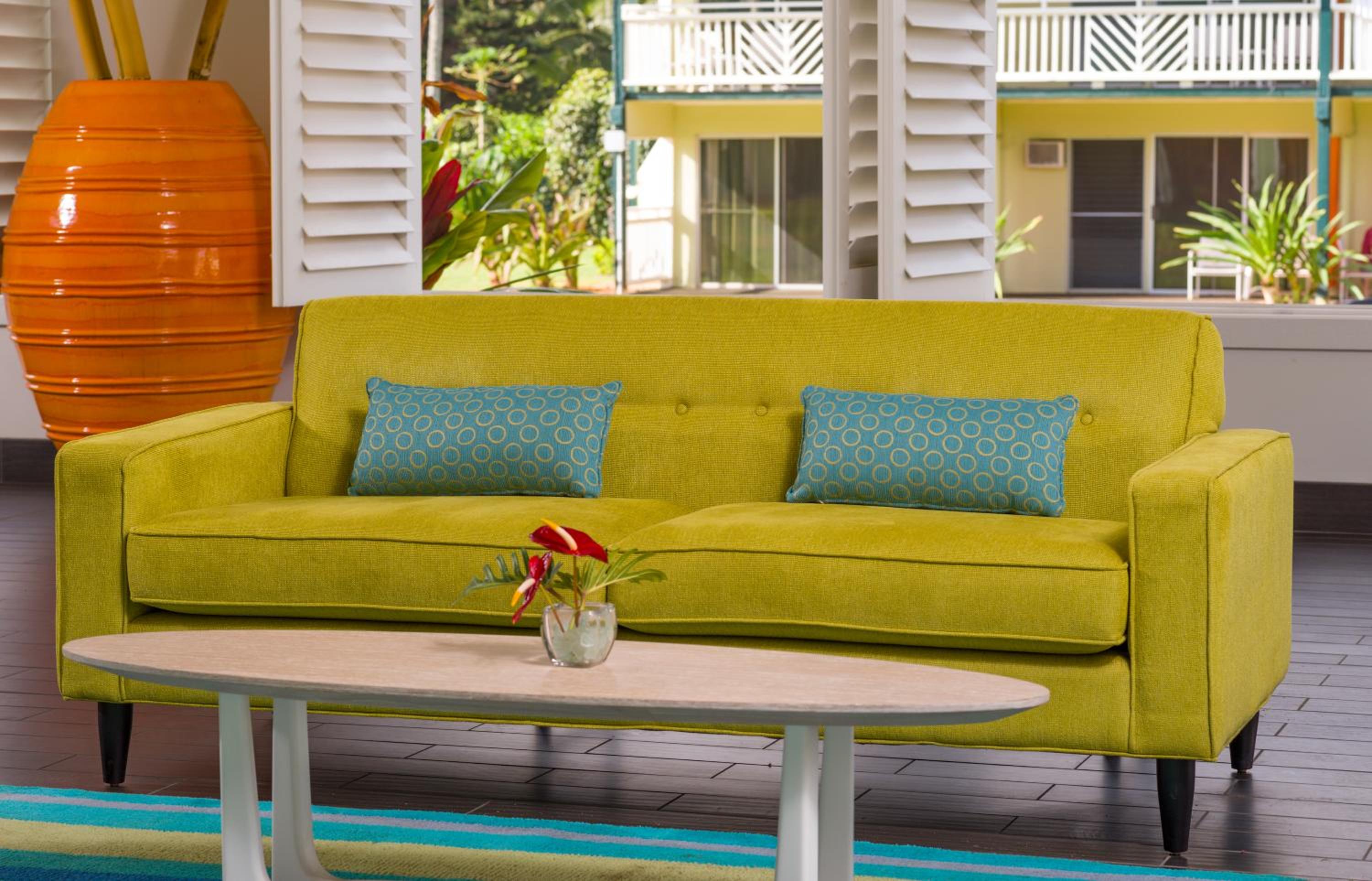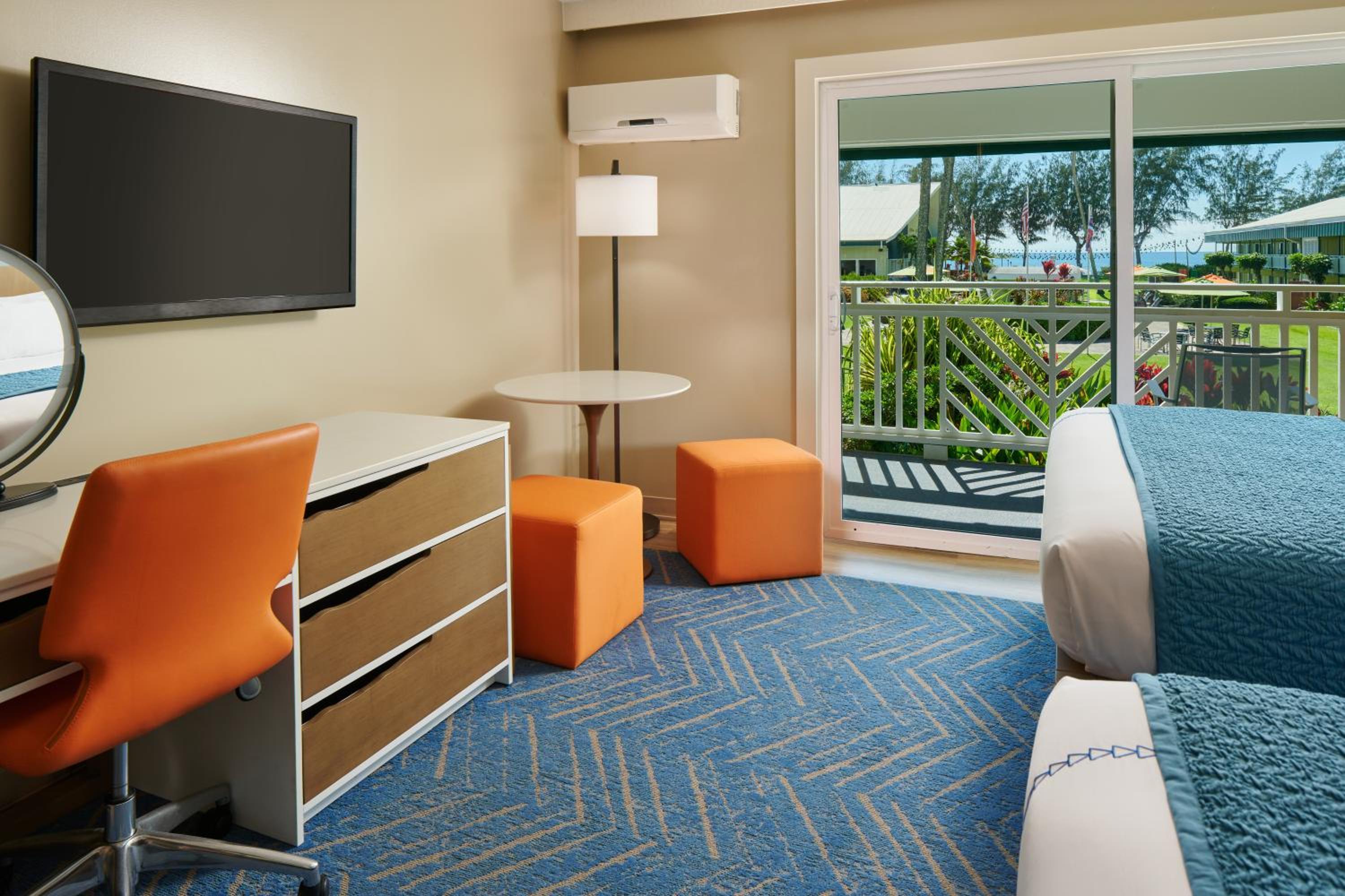 The guest rooms at Kauai Shores Hotel are designed with a sleek, retro-modern style that perfectly complements the vibrant island colors and island-style decor. Private lanais offer stunning views of the mountains, garden, pool, or ocean.