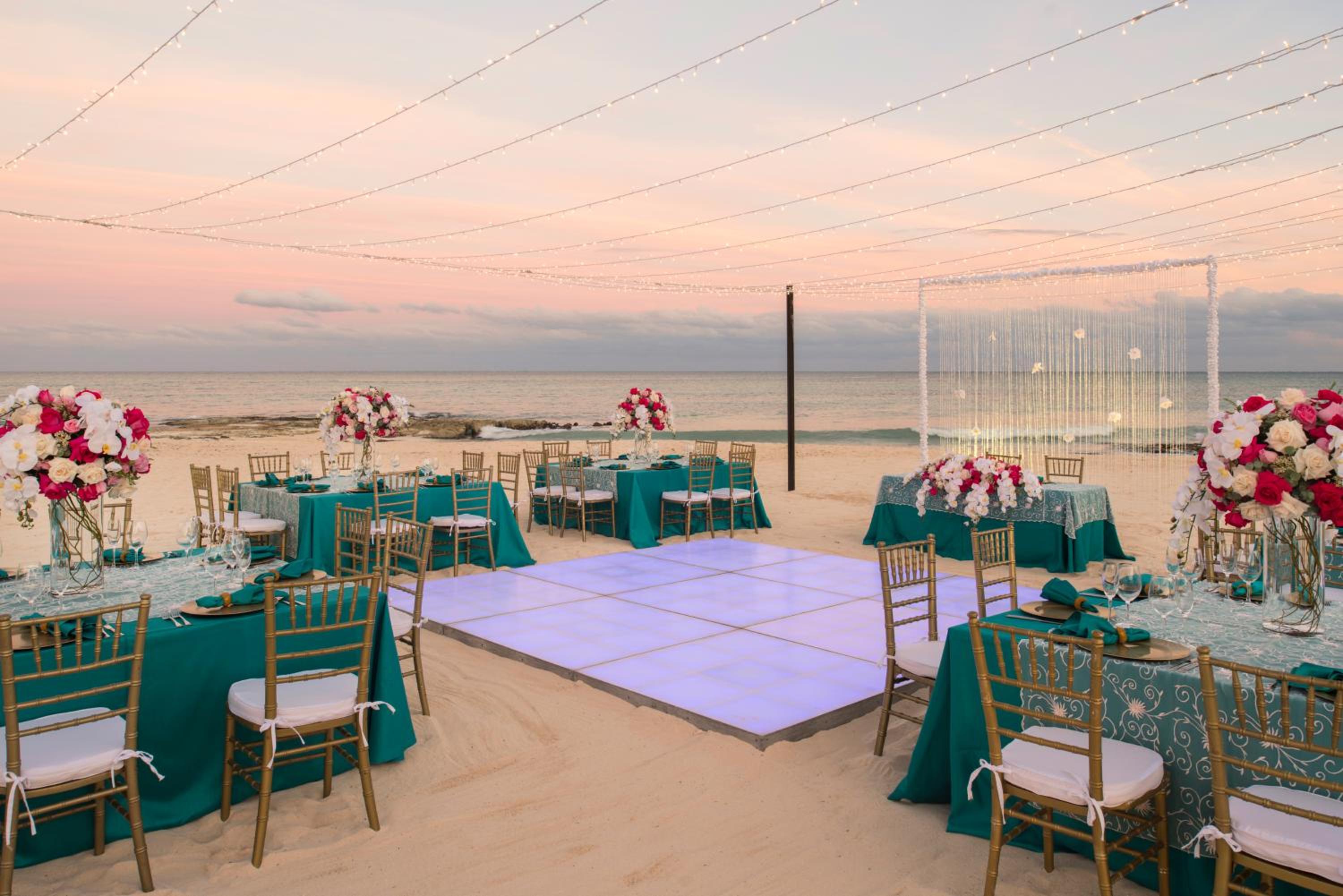 We hired a DJ, MC, and florist and added an LED dance floor (a tip for future couples: if you expect a larger crowd, consider sizing up). We had sparklers go off at the end of our first dance, and a giant S & P (for Sue and Pete) that was light-up. The music kept everyone dancing all night, with blow-up instruments, light-up wrist bracelets, and light-up sunglasses. and even guests from the resort sat on surrounding cabanas to enjoy the celebration. Some that we knew, even made their way onto the dance floor by the end of the evening.