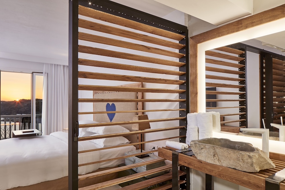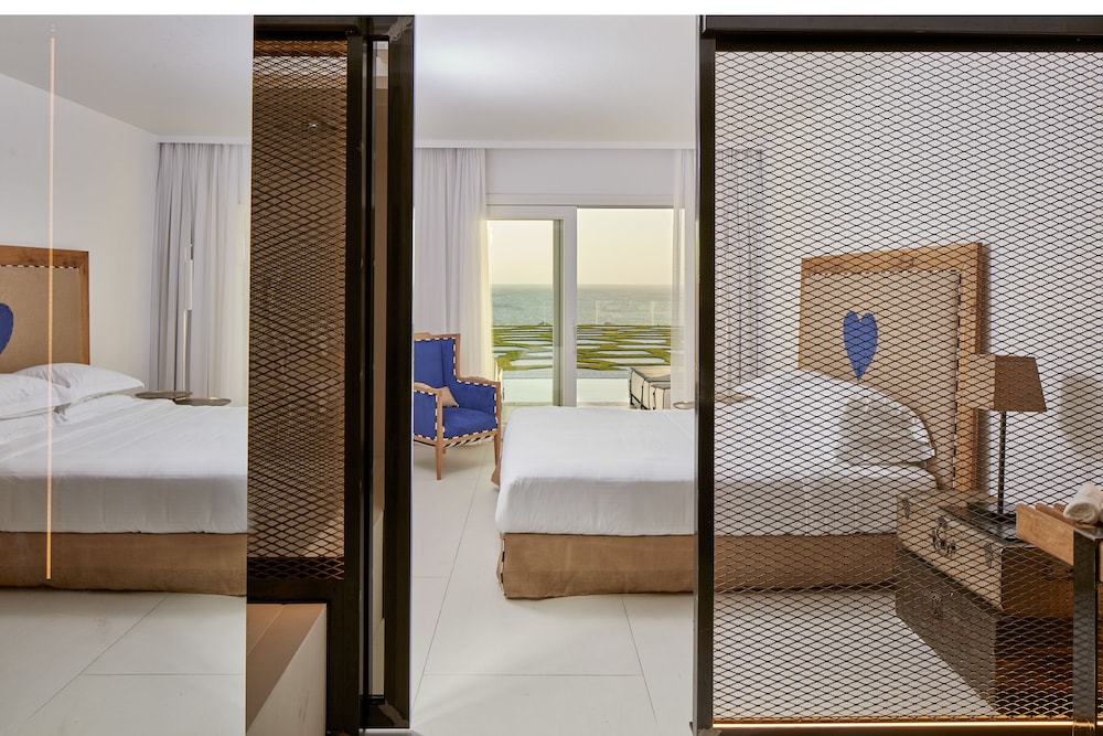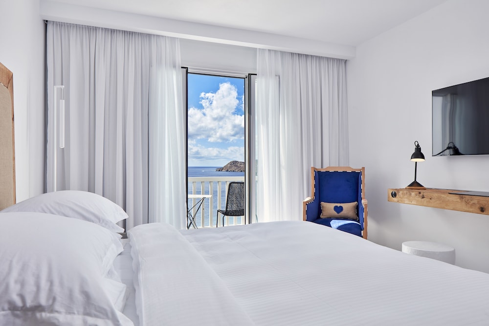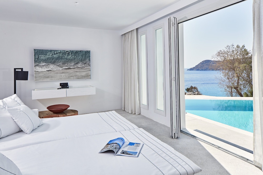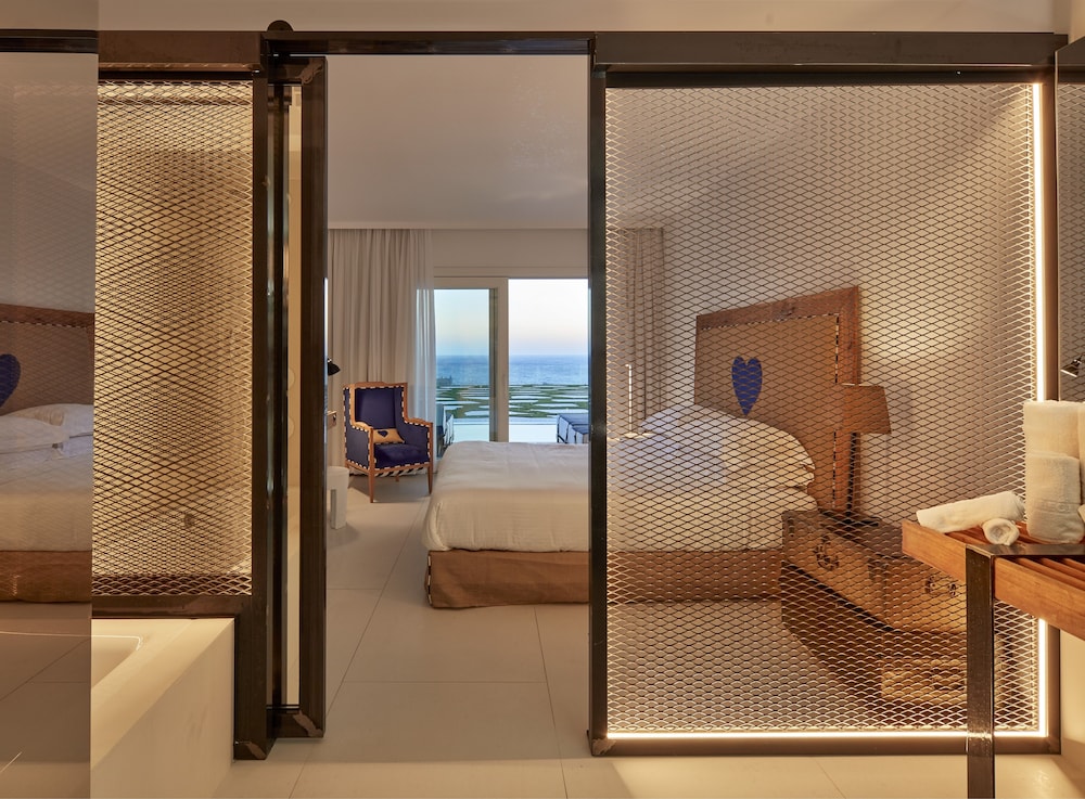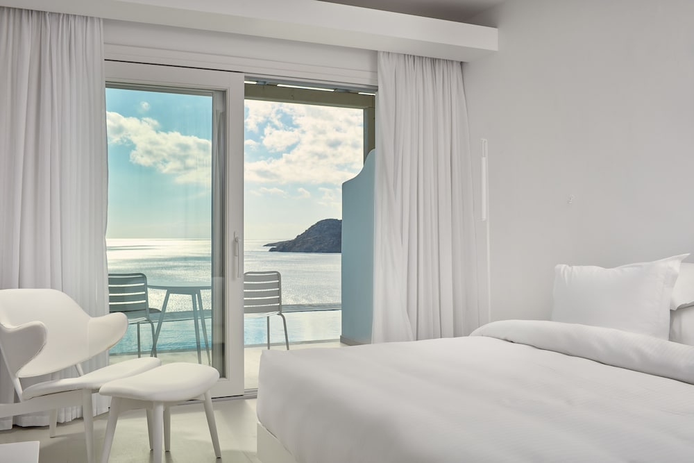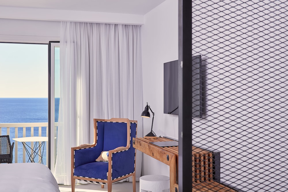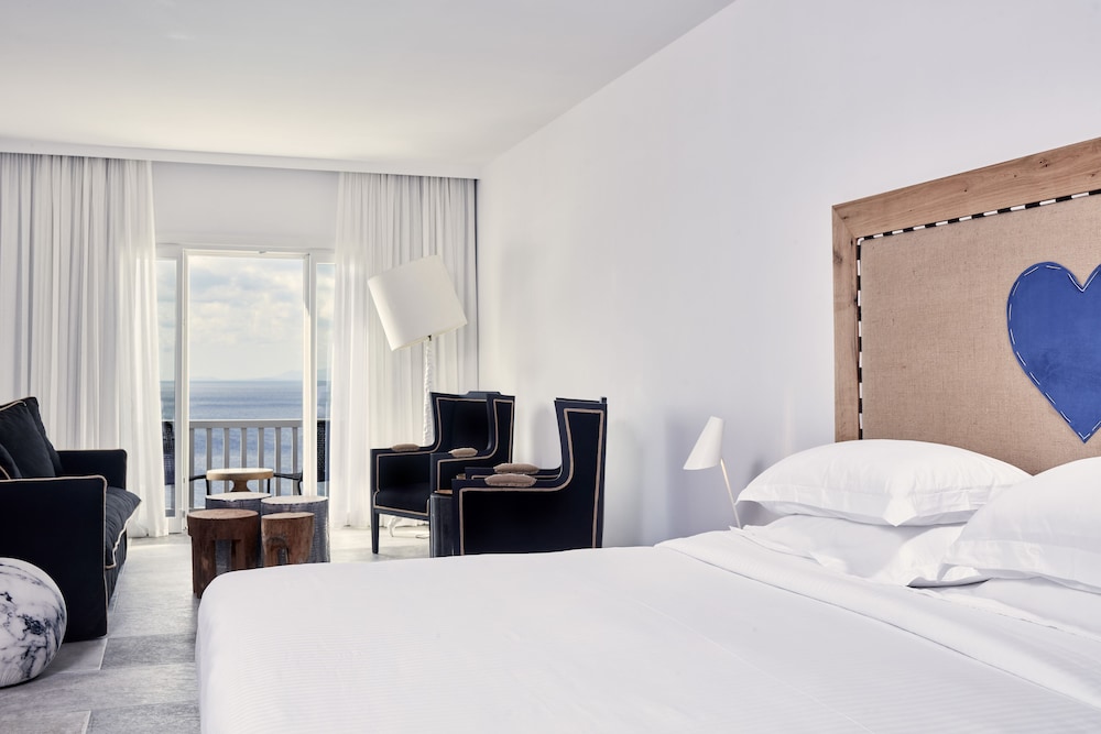With a tranquil setting that overlooks the stunning Elia beach, the Royal Myconian Resort & Thalasso Spa Center is designed for maximum relaxation. The modern rooms are equipped with Wi-Fi, flat-screen TVs, and minibars, and all offer balconies or terraces with expansive sea views. For an extra touch of opulence, upgraded rooms, suites, and villas add features such as whirlpool tubs, living rooms, sofabeds, and private pools.