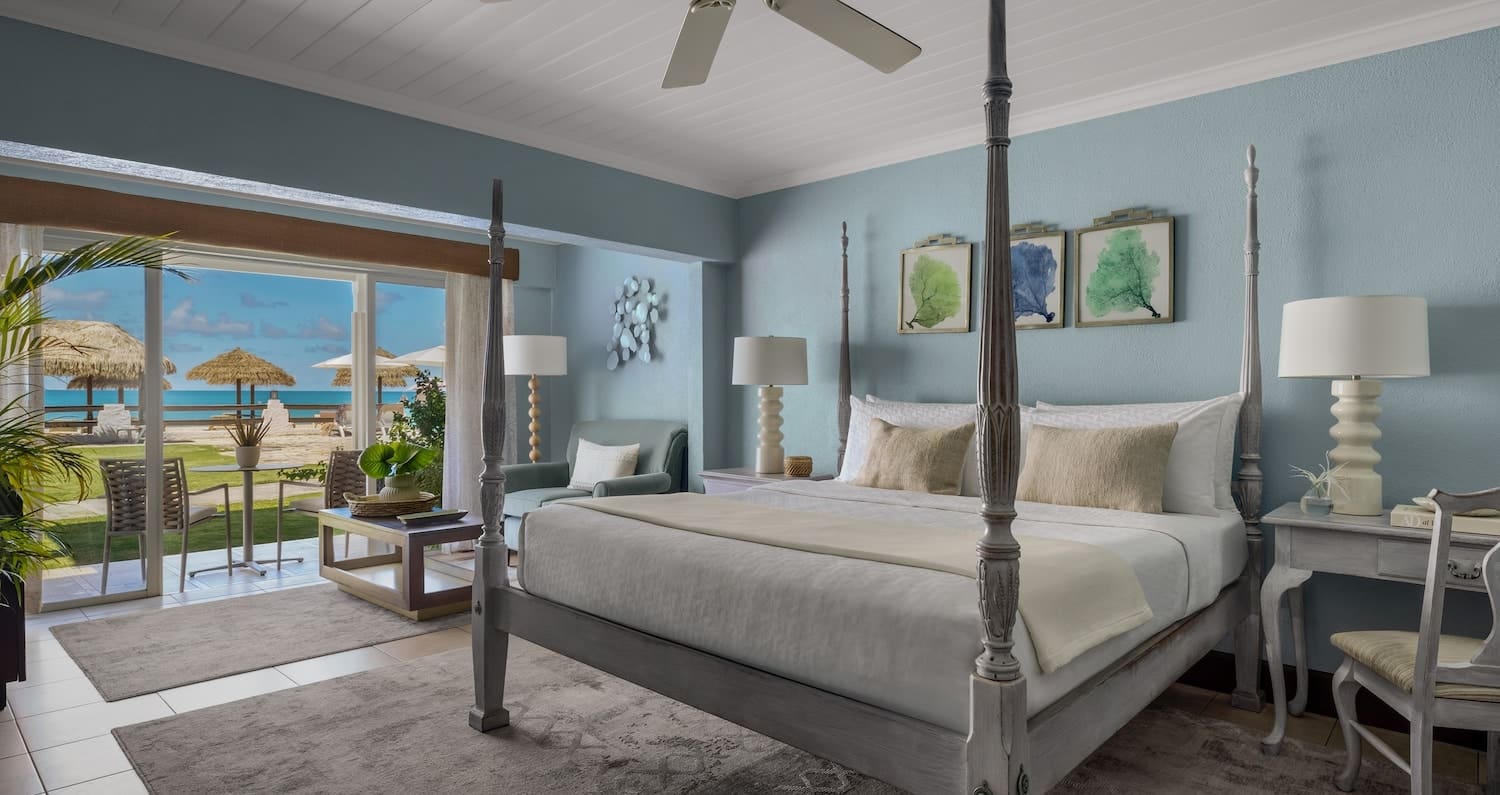 Located on the ground floor, the spacious Caribbean Honeymoon Grande Luxe rooms feature a private patio that opens directly onto a quiet cottage pool and beautiful gardens. On the interior, the room features a four-poster, king-size bed, flat screen TV, and en-suite bathroom with a bathtub / shower combination. These rooms also come fully stocked with local beers, wines, juices, and sodas.
