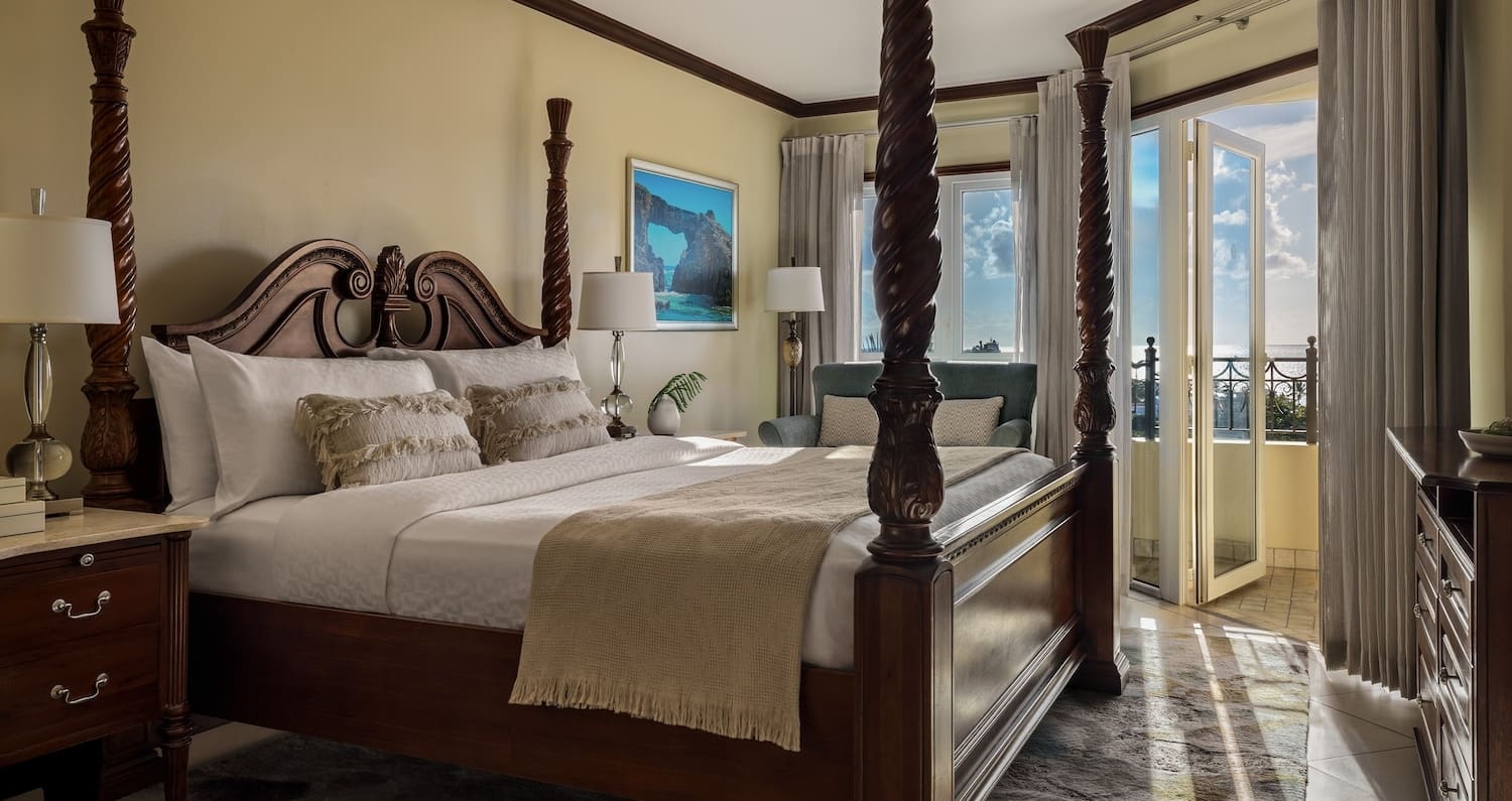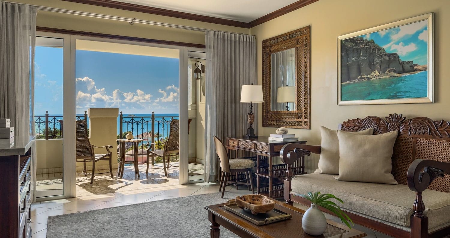 Located in the Mediterranean Oceanview Village, the Mediterranean One Bedroom Butler Villa features the best views of Dickenson Bay. Honeymooners can soak up the sun on a private patio, complete with pool and whirlpool. On the interior, there’s a spacious living room with mahogany furnishings, a fully stocked bar, flat screen TV, and a bedroom with a four-poster, king-size bed. The spa-like en-suite bathroom features a whirlpool tub and separate walk-in rain shower.