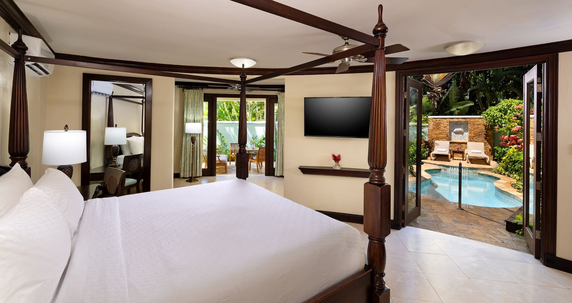 The Bamboo Grove One-Bedroom Skypool Butler suite is located on the fourth floor, with a spiral staircase leading up to a private SkyPool on a personal rooftop terrace to soak up the sun. Inside the suite, honeymooners can expect a spacious living room, separate dining room, king-size bed, and HD Smart TV. The luxurious bathroom includes his & her bath vanities, plush robes, and an amenity kit from the Red Lane Spa — Sandals’ very own on-site spa.