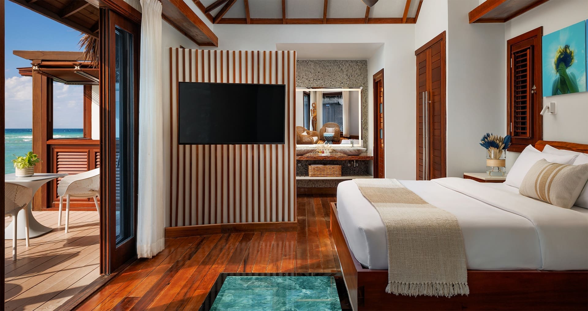 Every bungalow includes king-size beds with soft linens and plush pillows, along with a smart TV and large ceiling fan. Spa-like bathrooms have his and her sinks and a walk-in rain shower. Outside, your private Butler suite includes a private patio, equipped with an extended sun deck, outdoor shower, and bistro set for two so you and yours can enjoy meals outside. Speaking of meals — this suite comes with a Butler Elite service, which includes 24 hour in-room dining and a private water taxi to take you to and from the mainland.