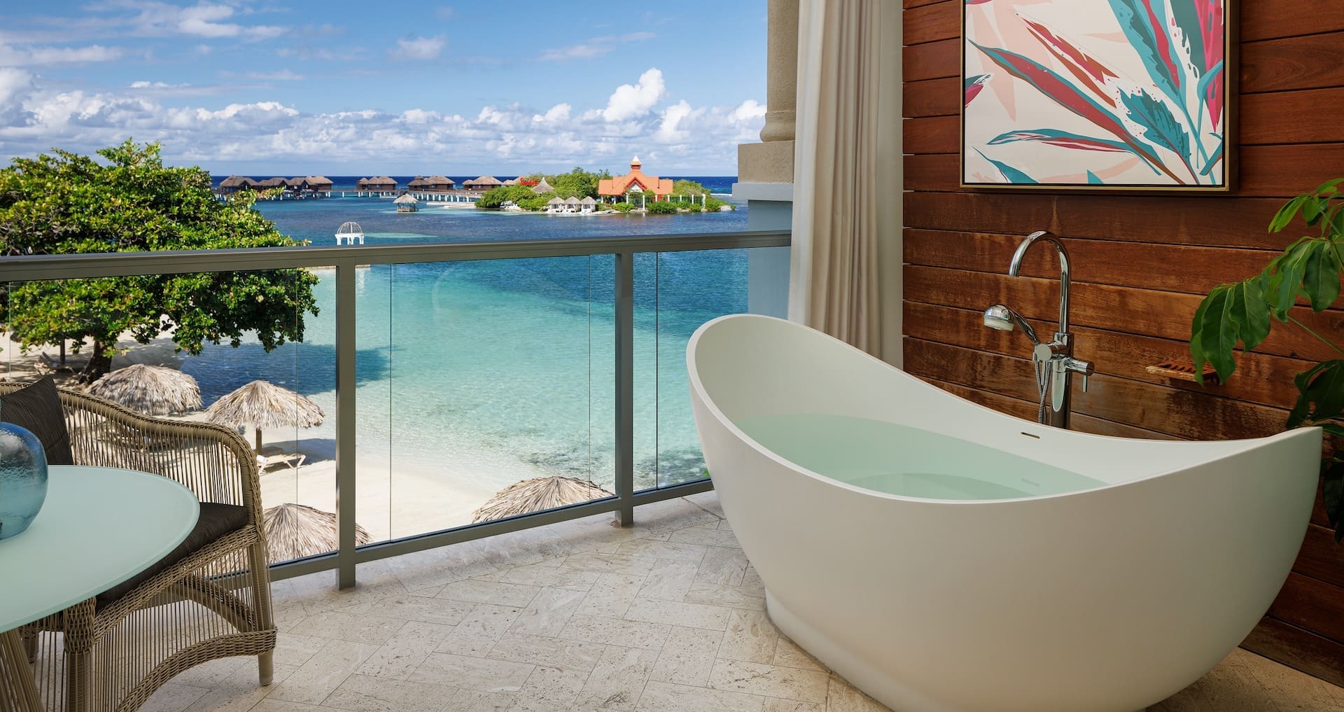 At the Club level, we recommend honeymooners enjoy the Windsor Beachfront Walkout Club Room at the Sandals Royal Caribbean Resort. Located directly on the beach at the ground level of the Windsor building, these newly renovated rooms include a patio and signature Tranquility Soaking Tub for two. The bedroom features a king-size bed and fully stocked bar, and the en-suite bathroom has a rain shower.