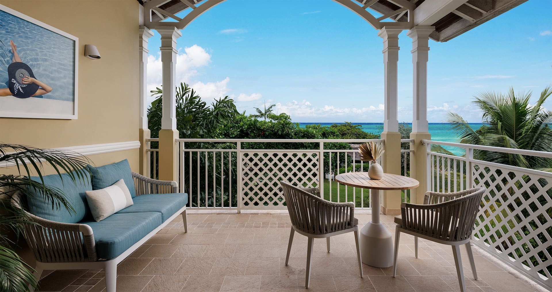 In the Luxury category at the Sandals Royal Caribbean Resort, we recommend the Caribbean Poolside Luxury Walkout. This newly renovated room is located on the ground level of the Arundel building, just steps away from one of the resort’s semi-private pools. Enjoy a Sandals signature Tranquility Soaking Tub for two or enjoy a meal on the bistro set outside. Each suite has a king-size bed, large HD Smart TV, and sliding door into a modern bathroom. The refrigerator will be continually stocked with bottled water, juices, sodas, and local craft beers + wines.