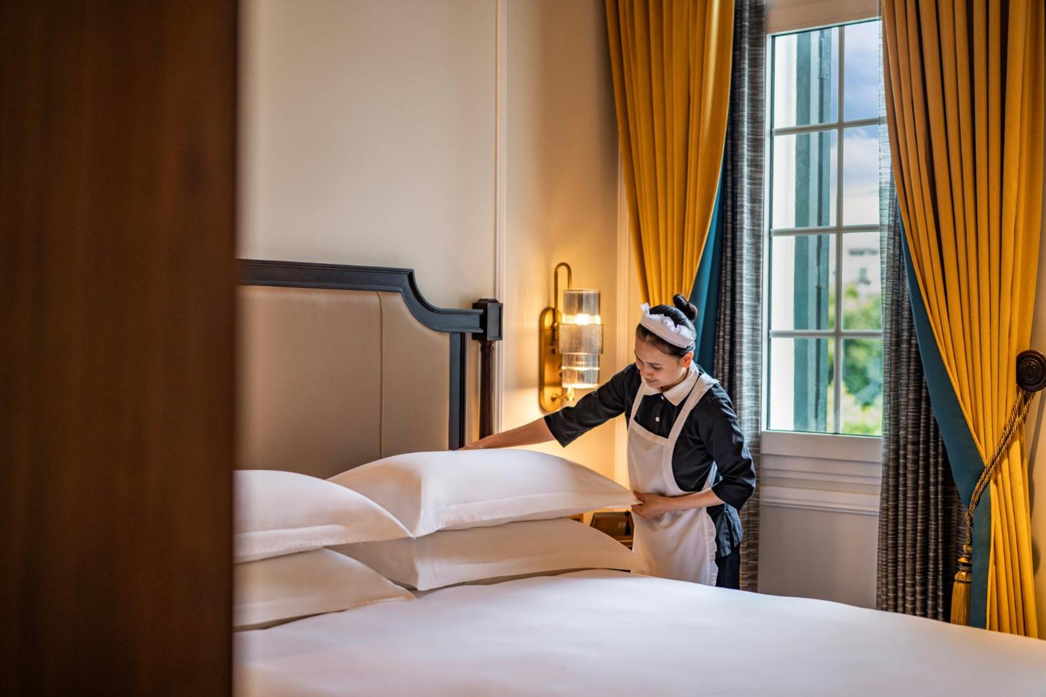 Each room in this refined hotel is a sanctuary of calm and luxury. Club-level rooms offer not just free Wi-Fi and flat-screen TVs, but also access to a lounge with complimentary breakfast, afternoon tea, and cocktails. The 24-hour butler service ensures your every need is met, and you can start each day in an airy room overlooking the lush gardens or the vibrant city. For an extra touch of opulence, consider one of the ornate suites, complete with a separate living room.