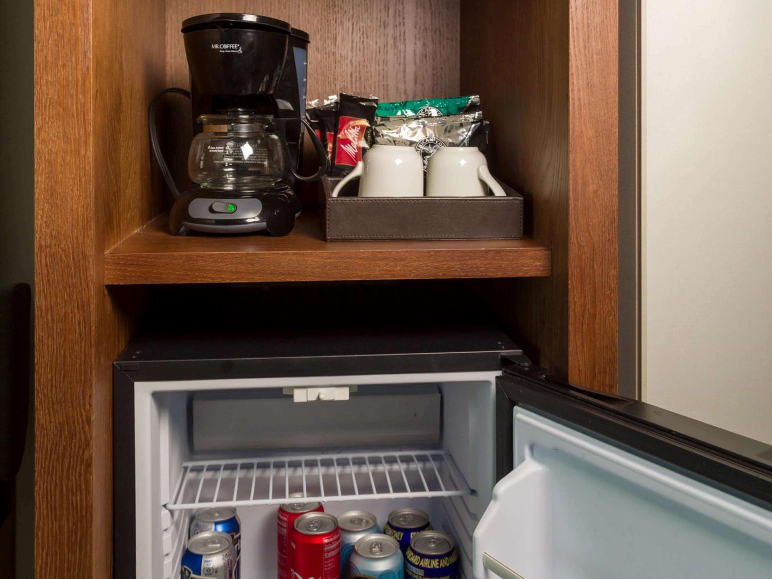 - Fully-stocked mini fridge with water and sodas