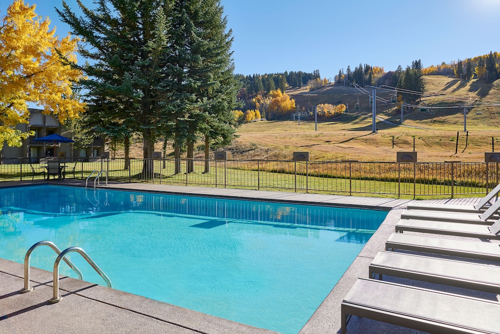 The outdoor space at The Inn at Aspen invites couples to relax and soak in the mountain atmosphere. The pool and hot tub provide a refreshing retreat, while the fire pit with Adirondack chairs offers a cozy setting for romantic moments under the stars.