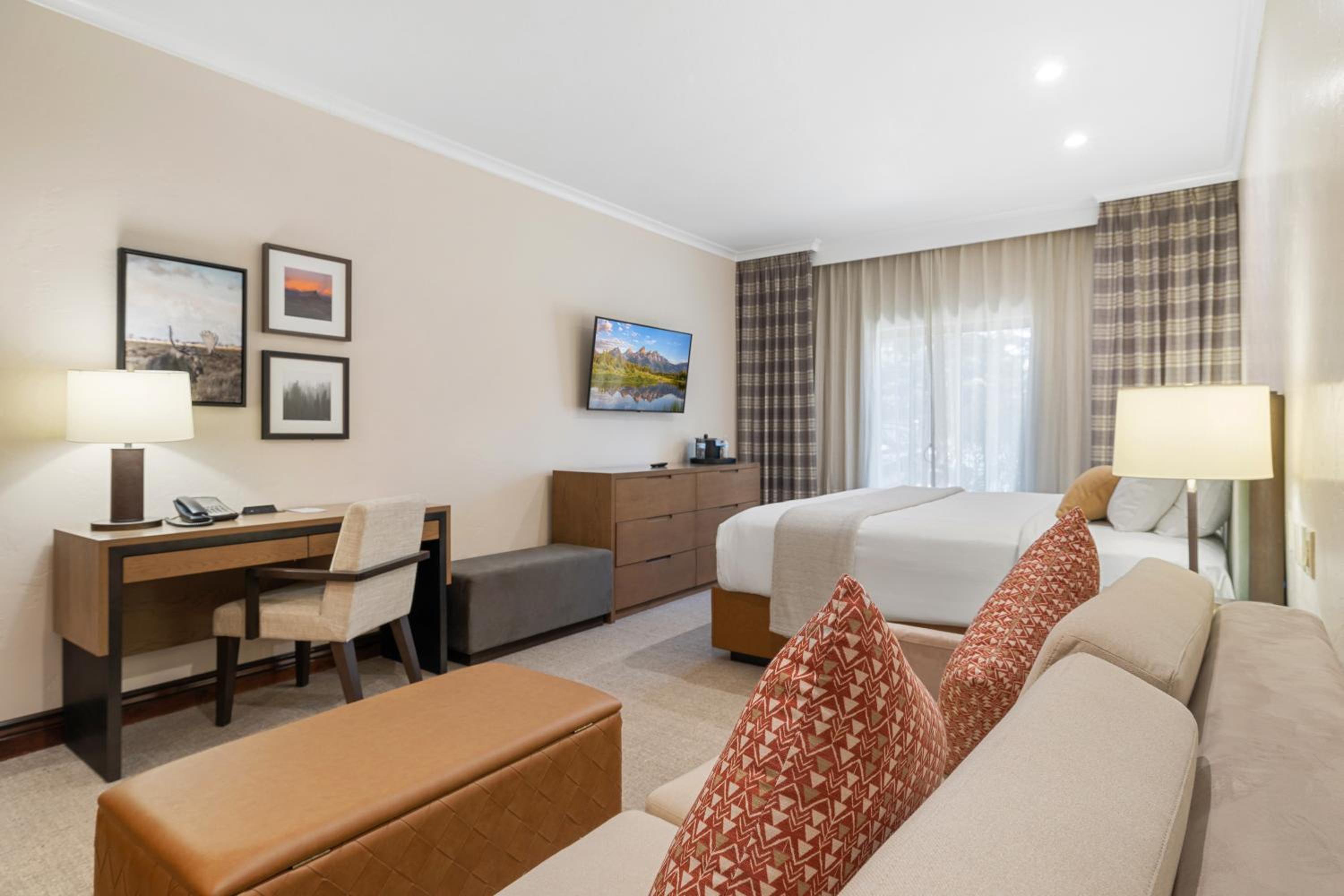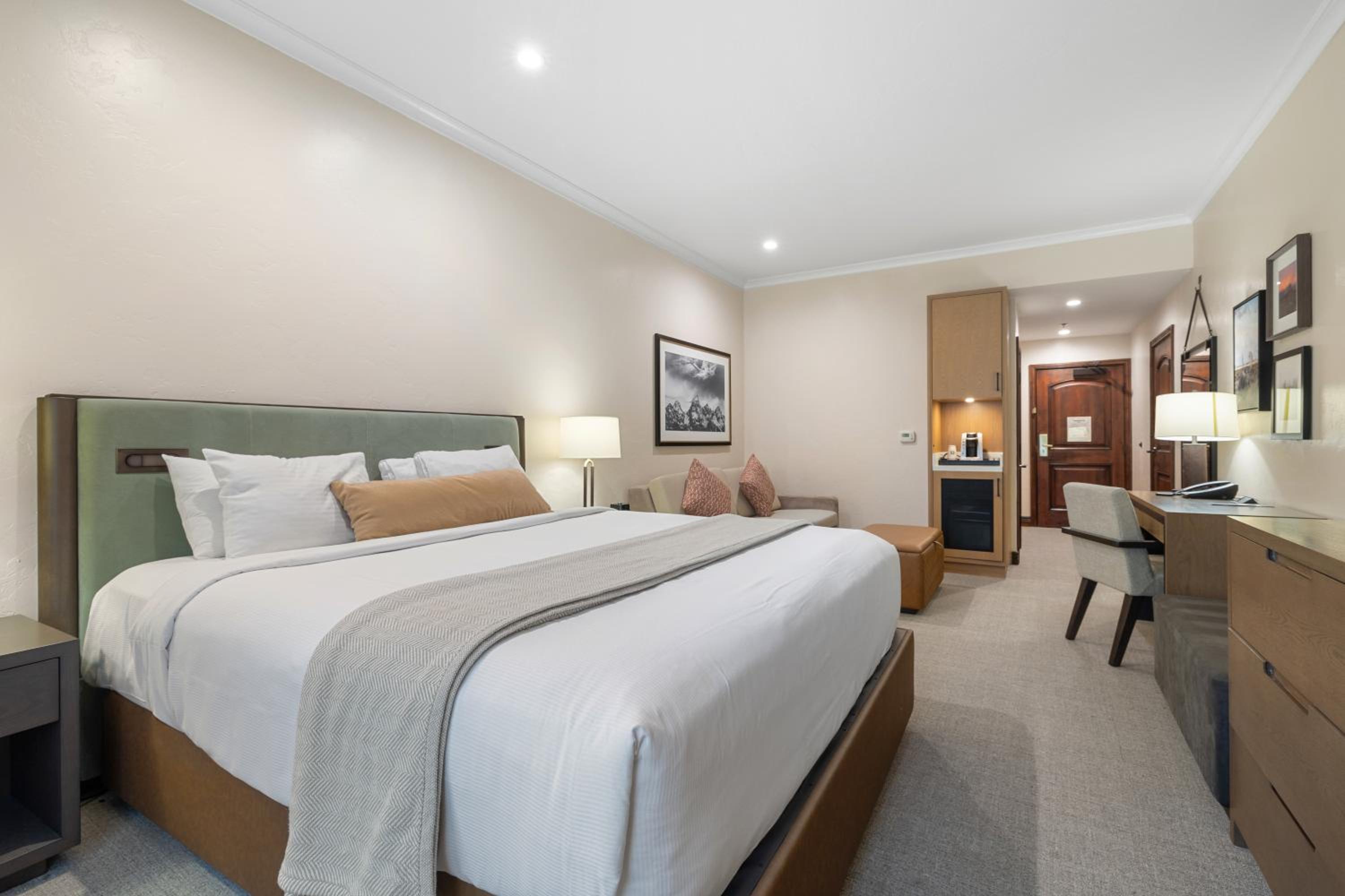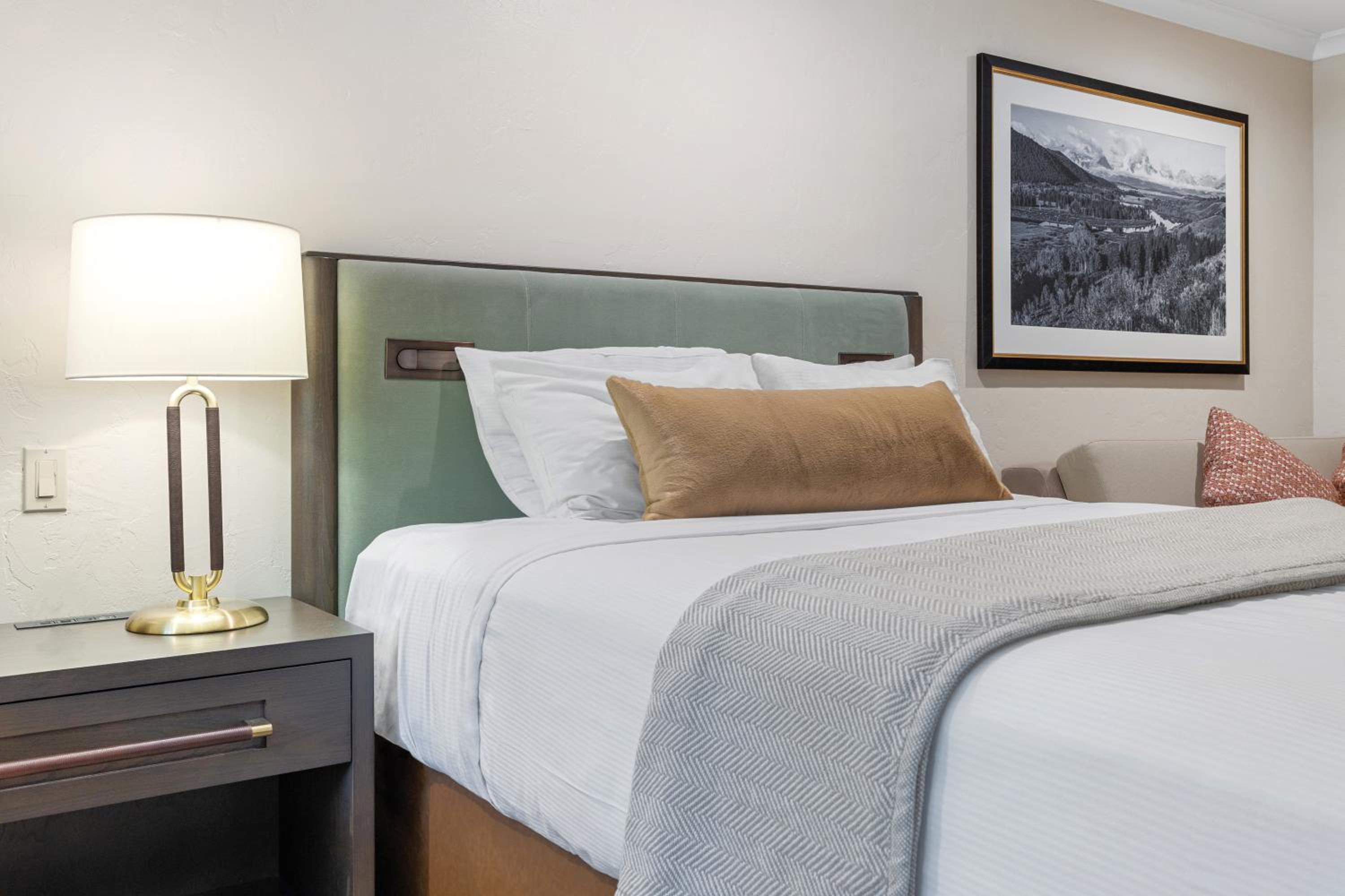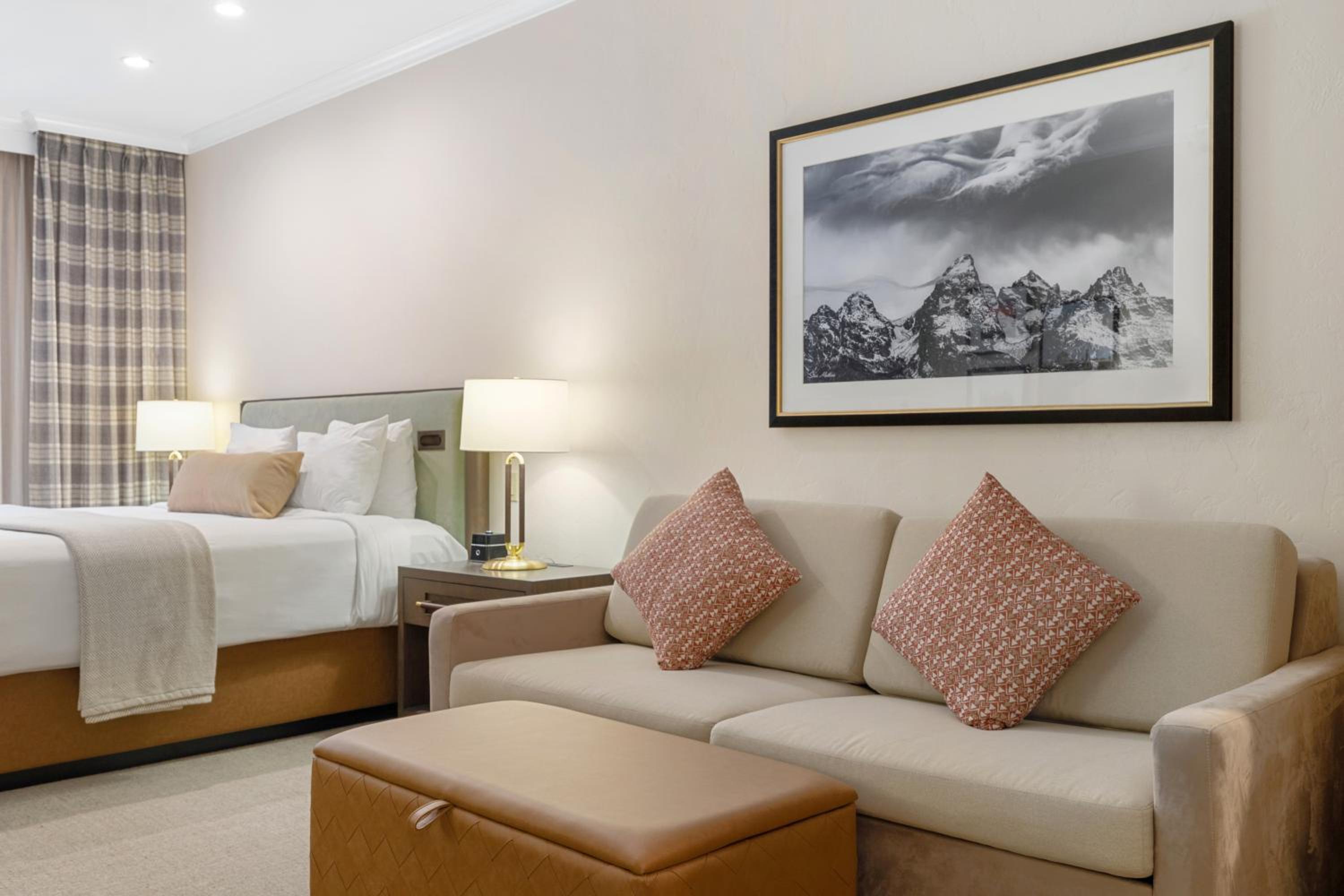 Each Premier Guestroom at The Lodge at Jackson Hole invites guests to unwind in style. The presidential double pillow-top mattresses, dressed with plush linens and accents, create an atmosphere of unparalleled comfort. A spacious sitting area, complete with a queen sleeper sofa, provides a cozy spot to relax and enjoy each other’s company.