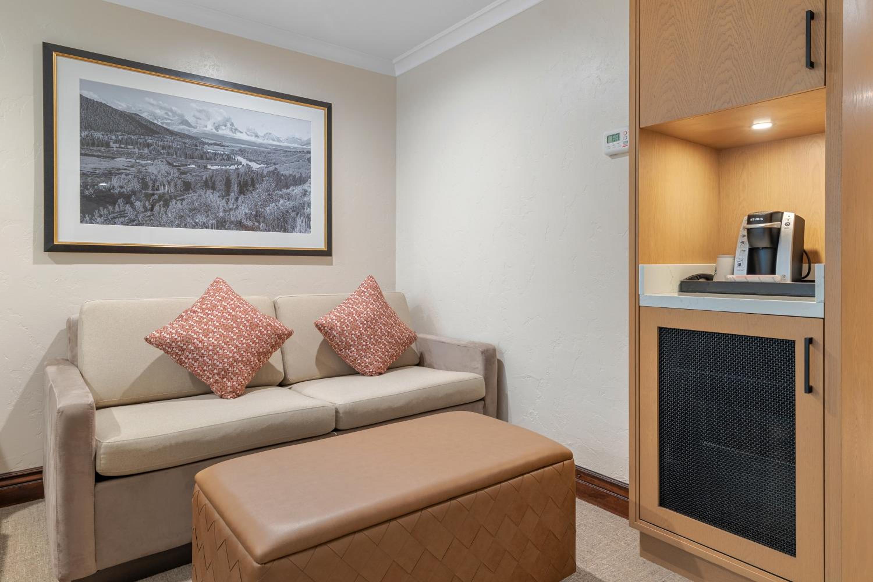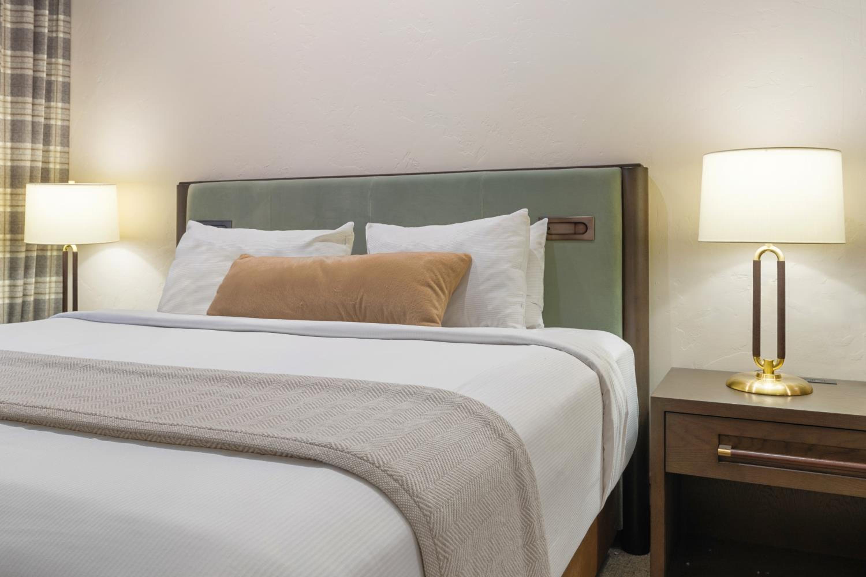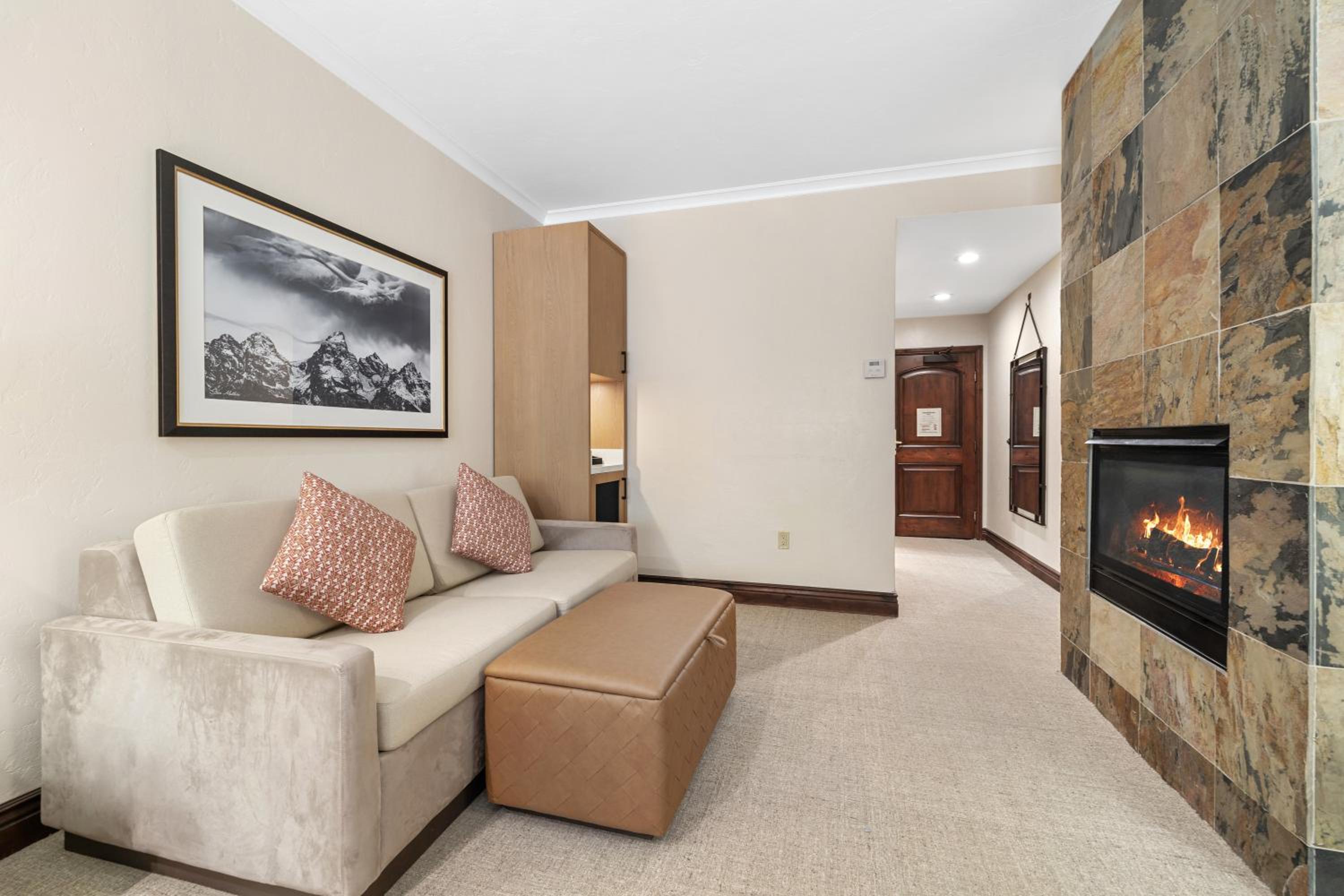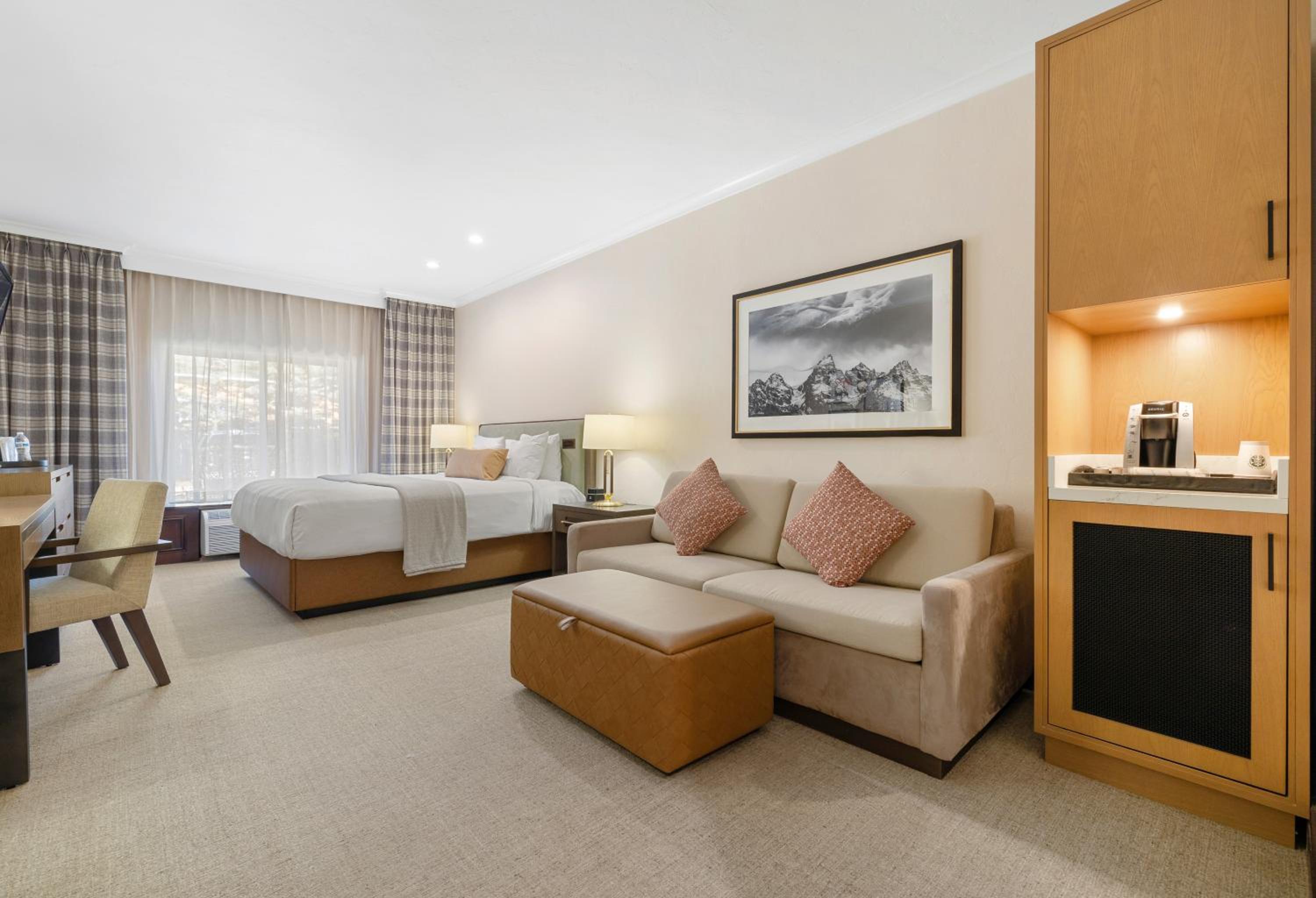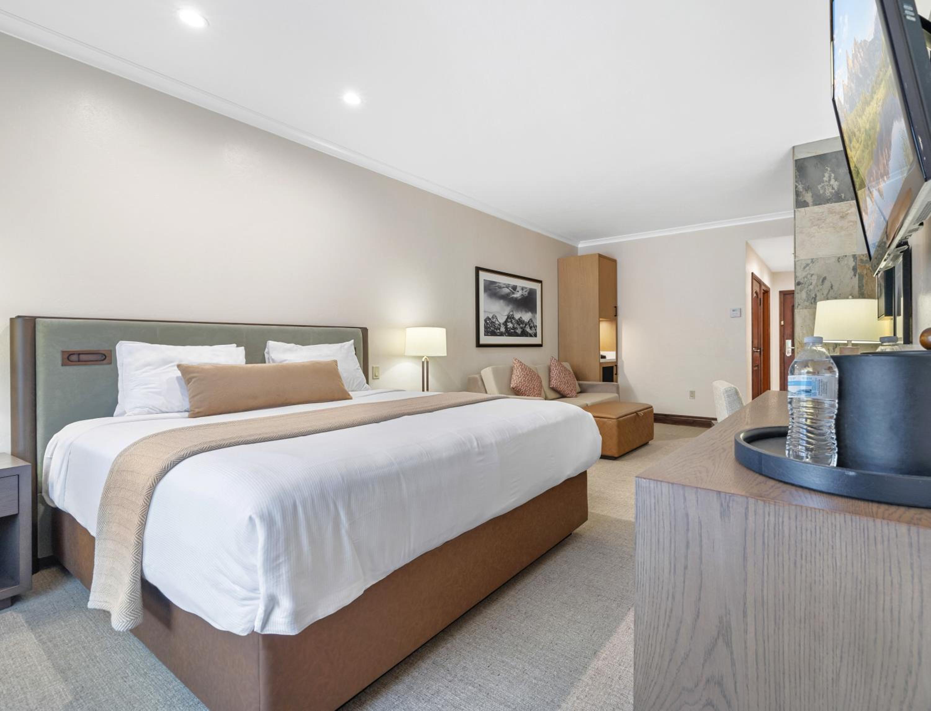 Each Premier Guestroom at The Lodge at Jackson Hole invites guests to unwind in style. The presidential double pillow-top mattresses, dressed with plush linens and accents, create an atmosphere of unparalleled comfort. A spacious sitting area, complete with a queen sleeper sofa, provides a cozy spot to relax and enjoy each other’s company.