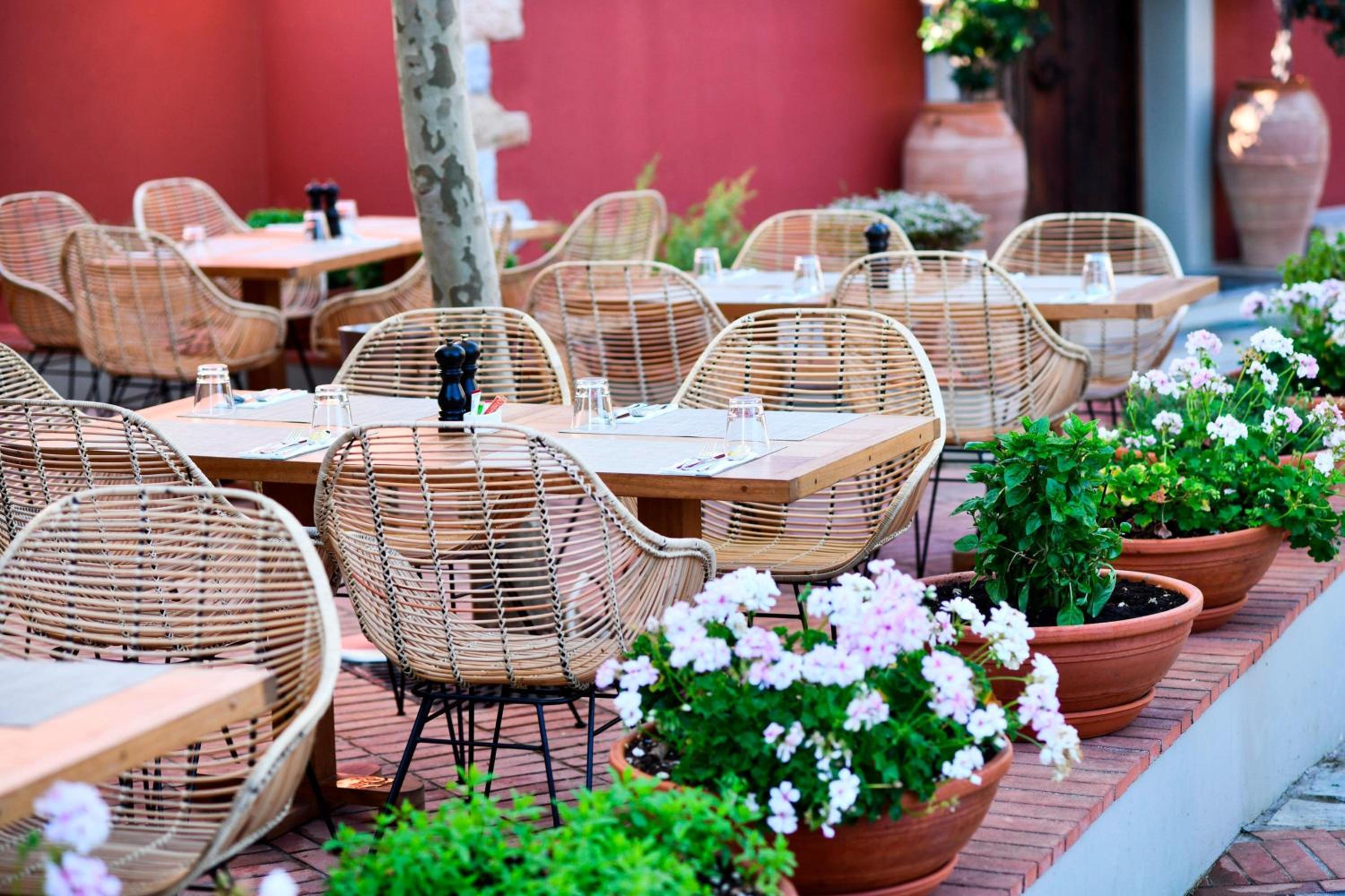 Discover romance in the understated rooms adorned with dark wood accents. These rooms offer complimentary Wi-Fi, flat-screen TVs, and cozy sitting areas. Step out onto the furnished terraces for breathtaking views of the garden, the sea, or the surrounding olive groves.