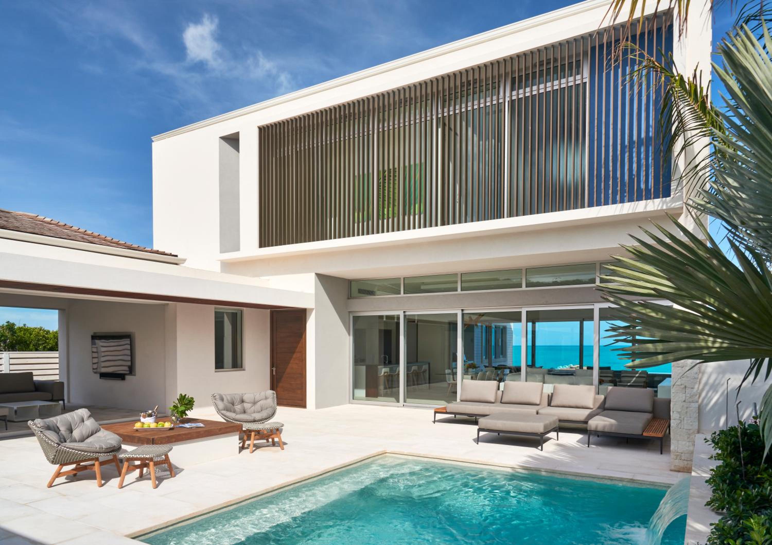 Wymara Resort boasts 91 spacious rooms and suites, each offering a breathtaking view of Grace Bay Beach. The lush, vibrant bougainvillea that dress the resort grounds create a delightful contrast against the sleek, whitewashed walls. This combination of contemporary design and natural beauty ensures an ambiance of relaxation and sophistication, perfect for those in love.